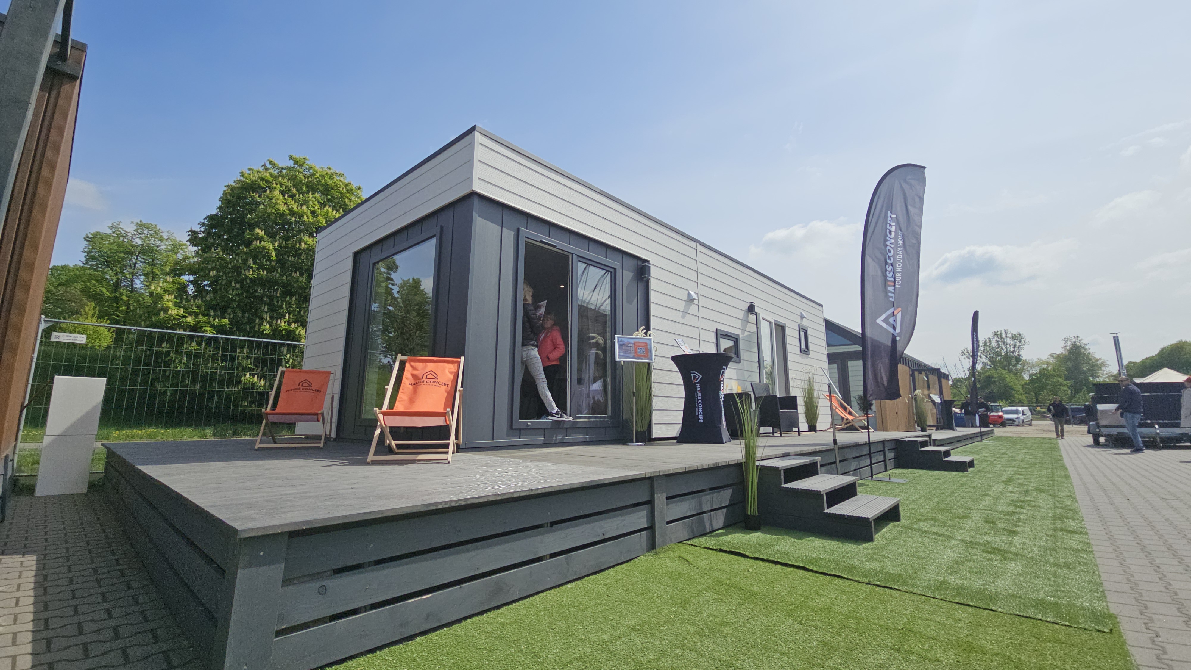 nordic exterior shot wykonaj wizualizacje tego domku mobilnego jako grafik wysokiej rozdzielczo ci sprzeda ow kt ra pokazuje ognisko i umieszcza domek na tle pi knych g r i blisko jeziora z wod z pomostem architecture
