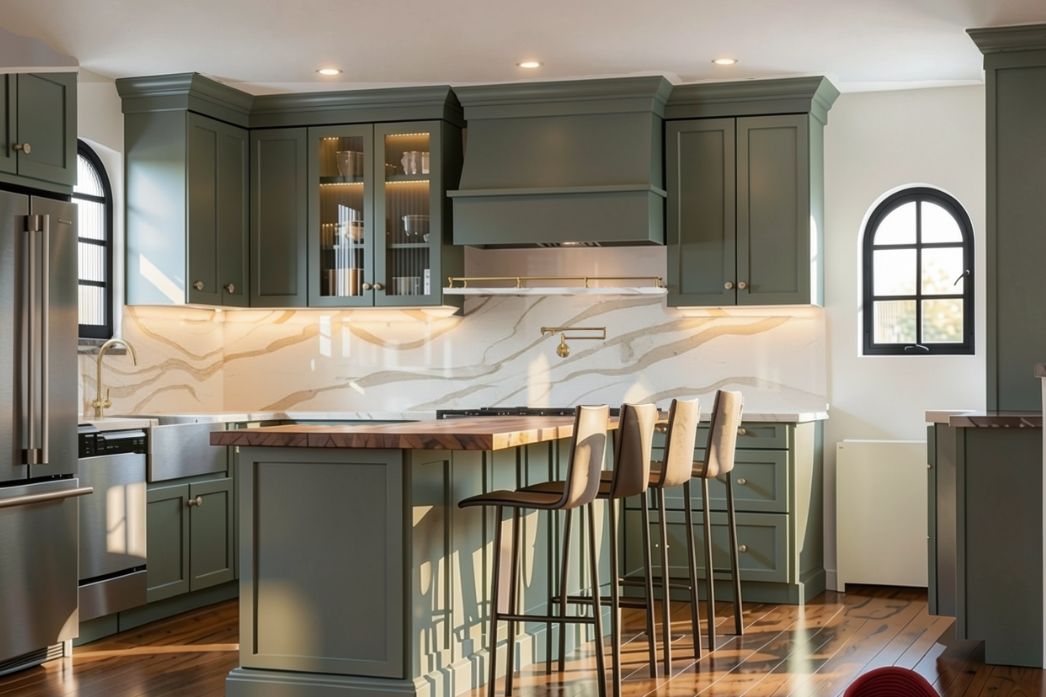 create a photorealistic rendering of the existing kitchen while keeping the layout exactly the same change the cabinet color to a muted gray green with a matte painted finish no gloss or reflections update the window to the left to have fluted glass with a black frame maintaining its current size and shape add a narrow shelf above the stove aligned with the top of the backsplash the shelf should be made of the same material as the backsplash and include a thin brass gallery railing on top ensure the ceiling is a clean flat white with no discoloration or variation use realistic lighting soft shadows and natural material textures to achieve a high end photorealistic result