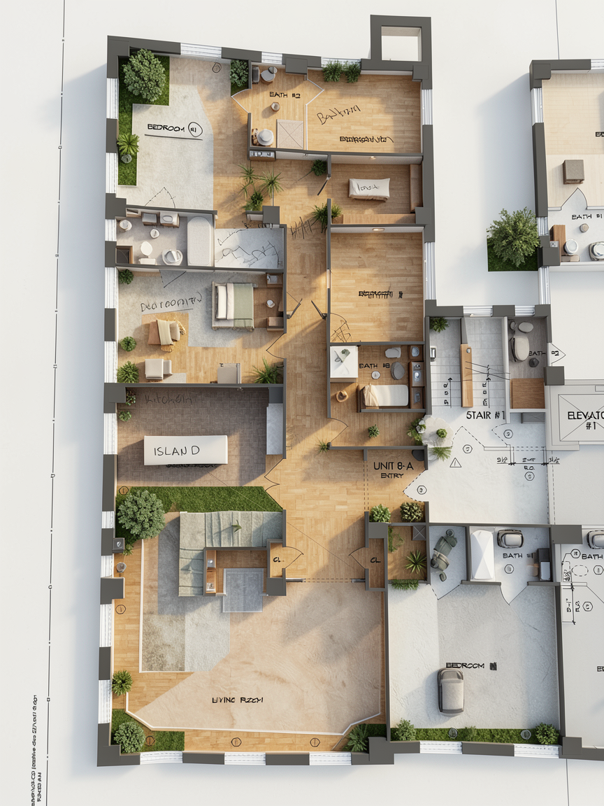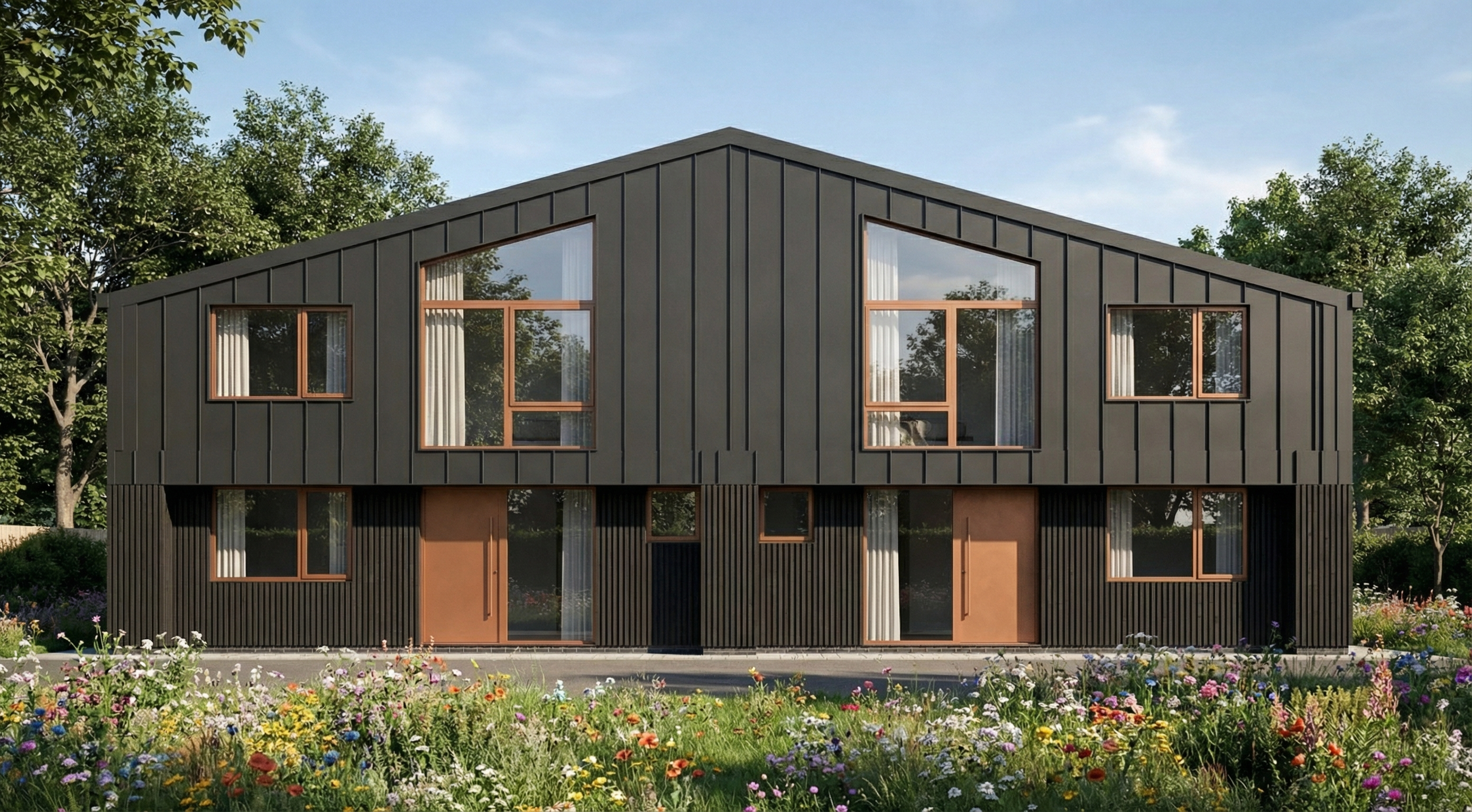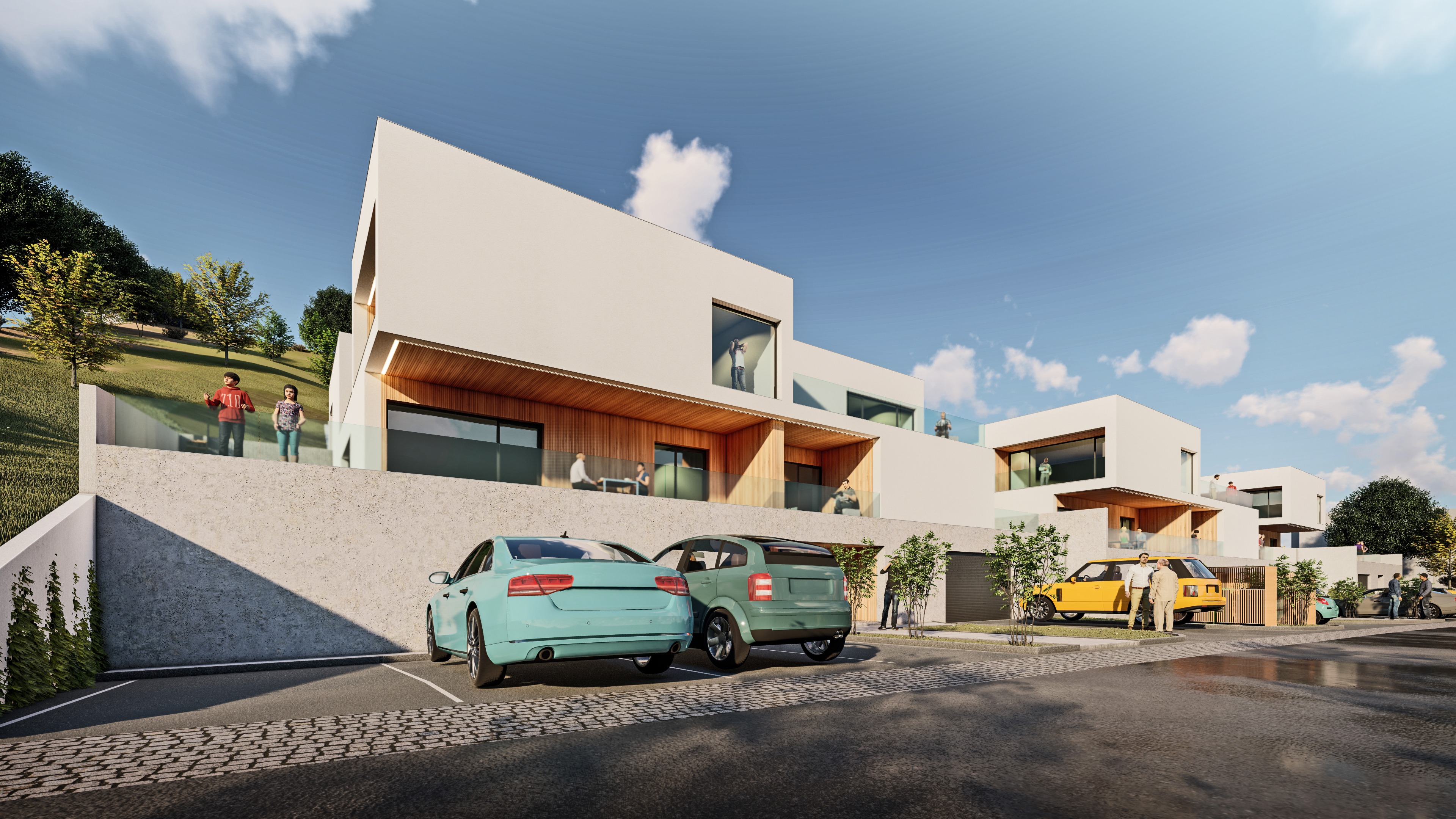 important preserve the existing geometry and the existing context exactly as provided do not modify alter reinterpret add remove scale or reshape any geometry do not change the site surroundings street layout neighboring buildings vegetation or context elements do not modify geometry scale proportions buildings road layout sidewalks or surrounding context in any way do not change text photorealistic architectural rendering clean and balanced contrast calm cinematic mood style contemporary european residential architecture minimalist premium understated include people subtle motion blur for realism