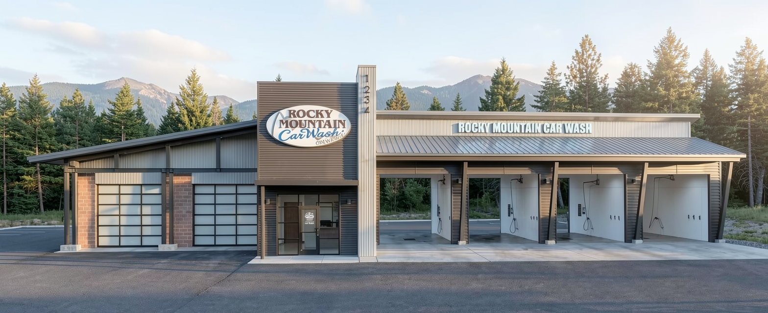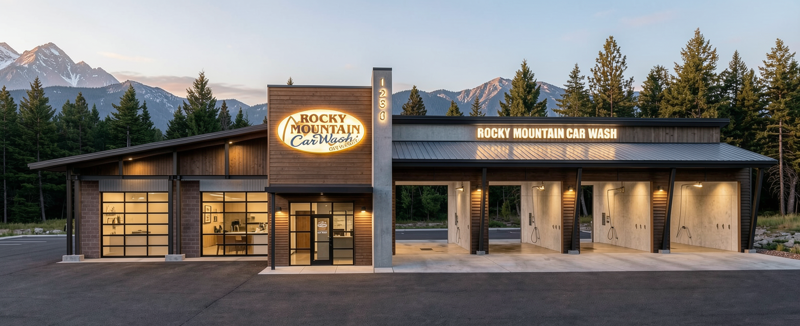 soft natural daylight slightly cool mountain light realistic shadows balanced exposure professional architectural photography hyper realistic architectural visualization editorial commercial architecture presentation clean composition sharp materials realistic reflections high detail bigfork montana at sunup in june show the address in lit numbers 2879 the number and the rock mountain car wash signs are lighted chnage the cmu block veneer on the left to be 8x16 ground face stack bond color is kanta browm