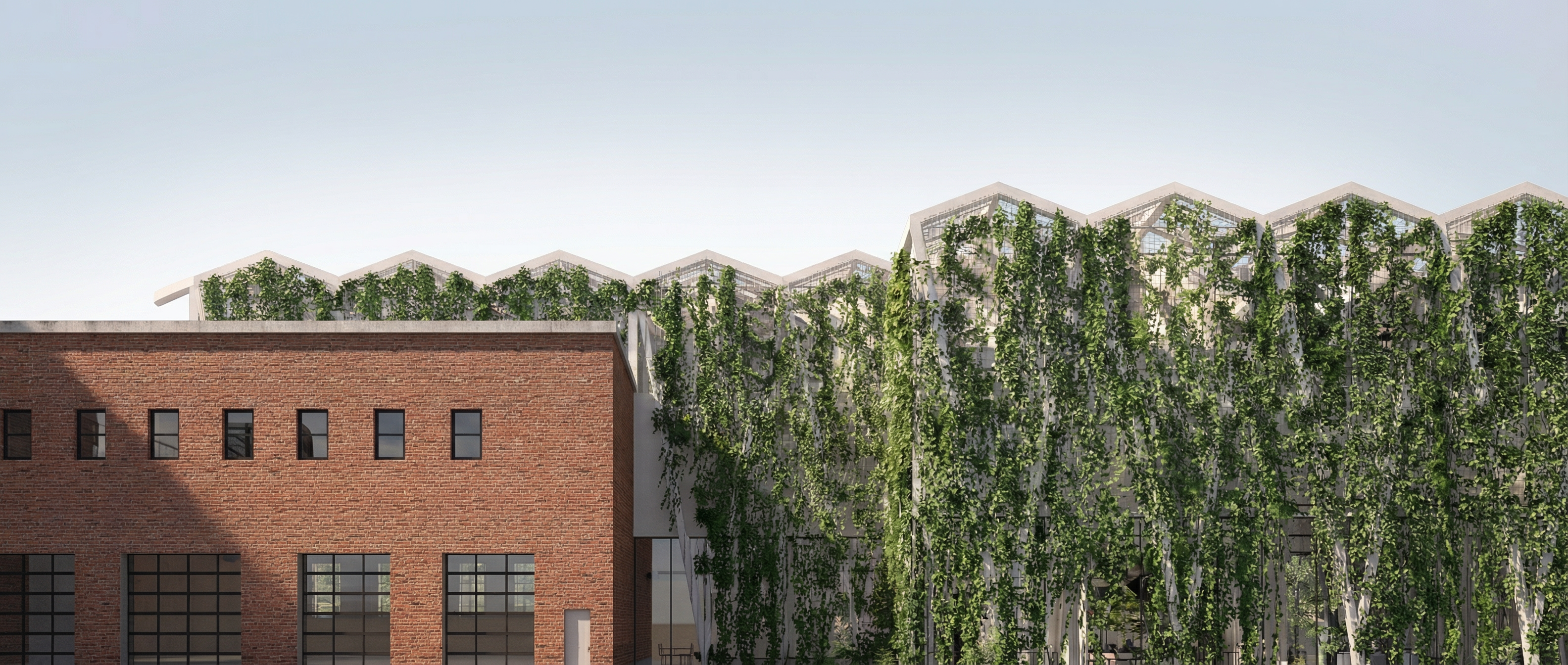 maintain the exact composition crop camera fa ade proportions and vine coverage from the starter image no redesign no changes to windows no new objects no added floors refine only lighting any glazing or fa ade surface partially visible behind the vines should appear softly illuminated brighten interiors subtly so they read through the vine veil but keep them abstract and diffuse no visible furniture or room detail only warm ambient brightness daylight mood not evening illumination should read as soft daylight penetration not artificial glow vines remain dominant the light simply prevents dark voids behind them this is a subtle daylight light fill correction only architecture and perspective must remain untouched