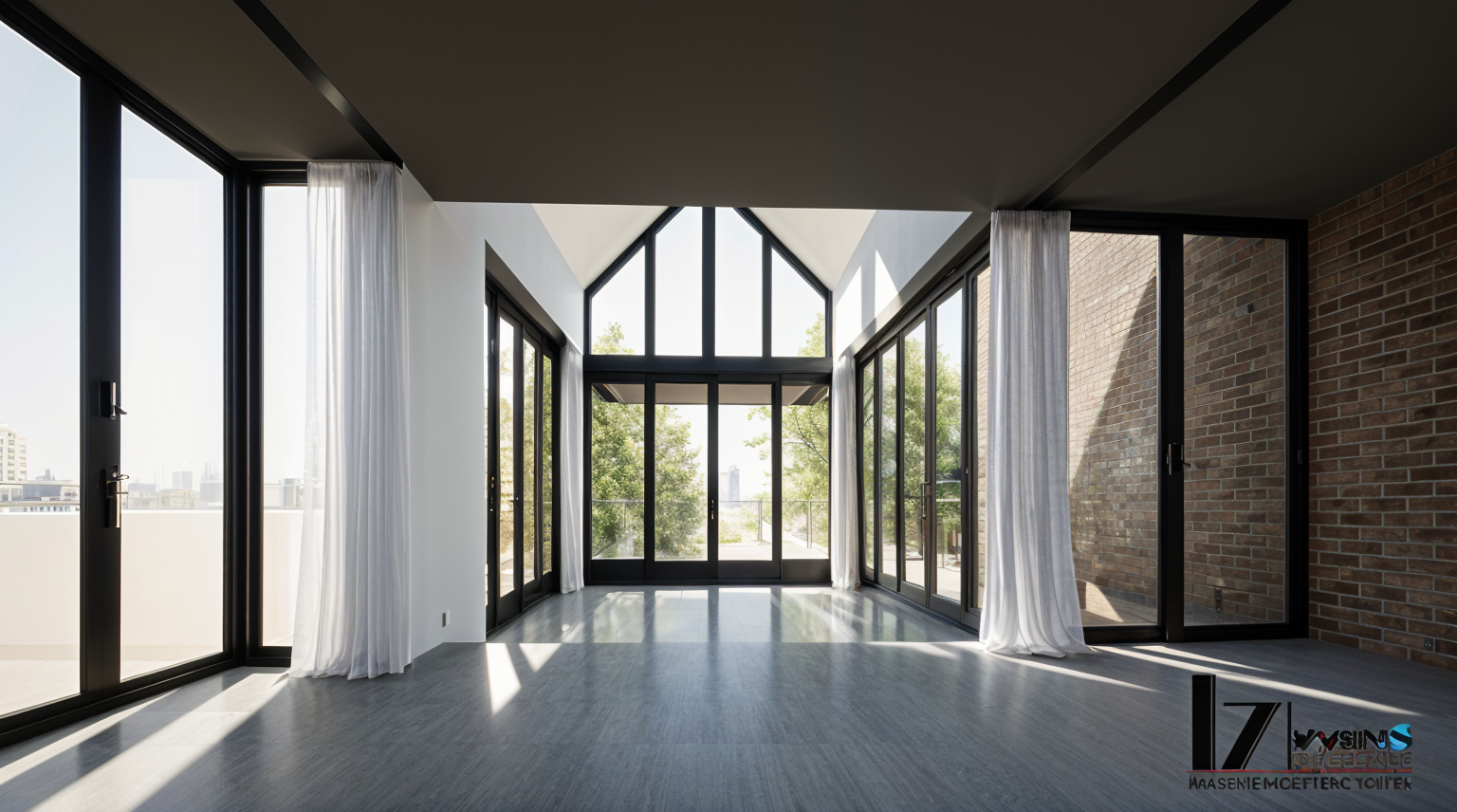 enhance the image to a photorealistic render add trees bushes and flowers on the front and sides of houses