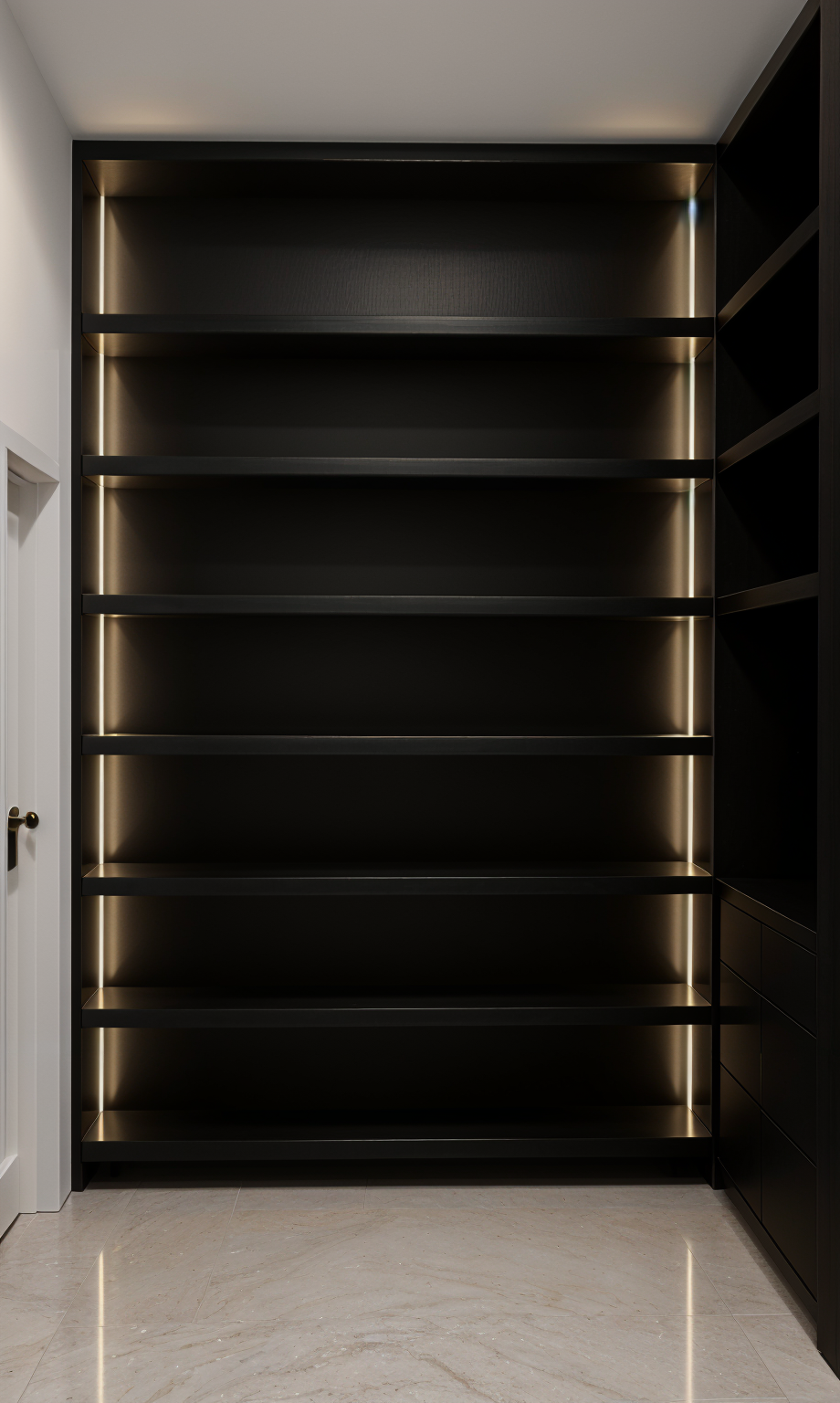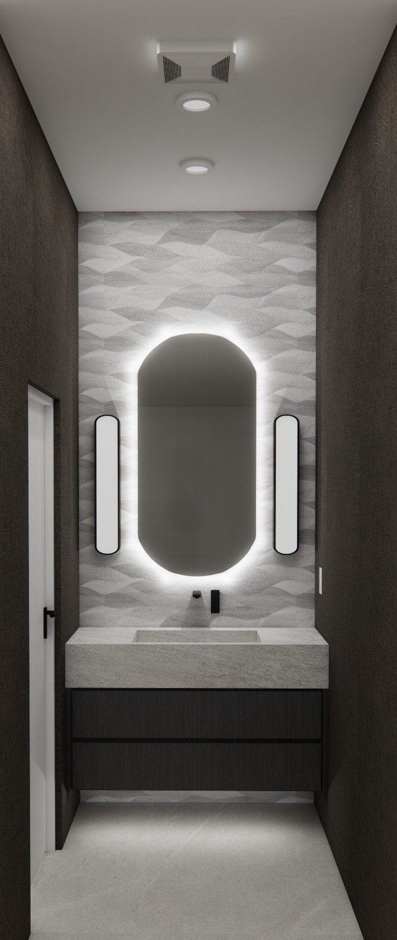 create a hdri photo realistic rendering do not change any image details do not move or modify features the cabinet should be an ash grey color and the cabinets should not have any hardware the wallpaper on the side walls and is textured like plaster the wall behind the vanity is wavy tile