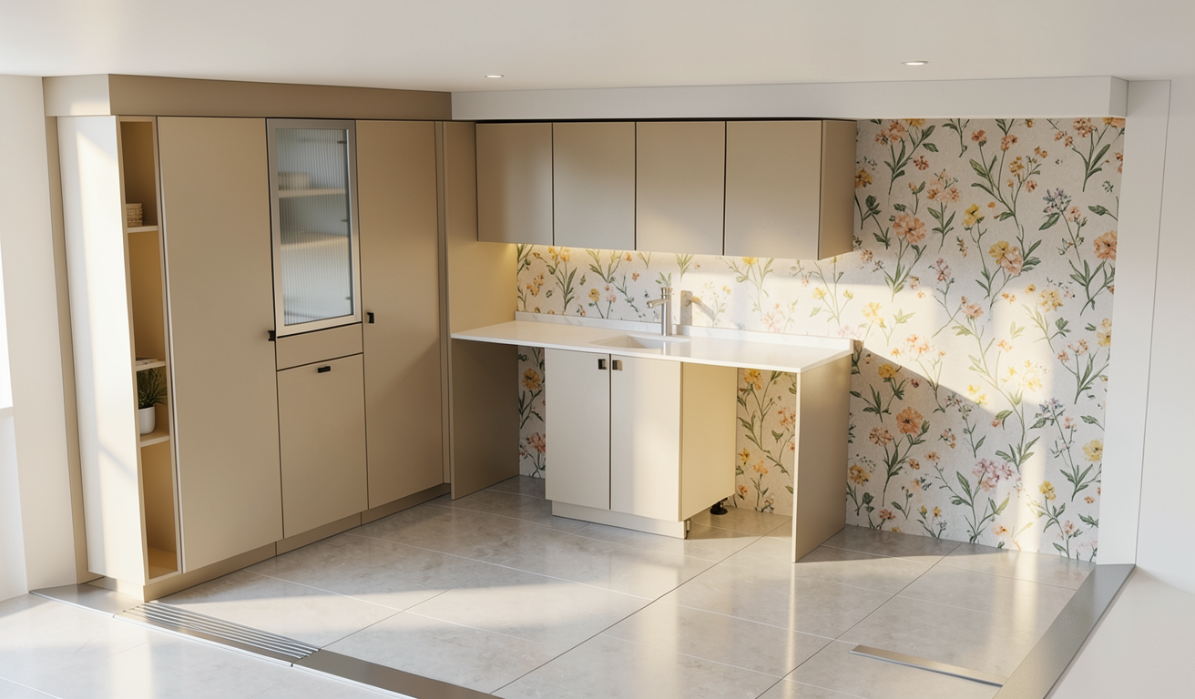 tienes que poner lavadora y secadora en acero inox en los huecos libres debajo de la encimera desplaza a la izquierda la secadora