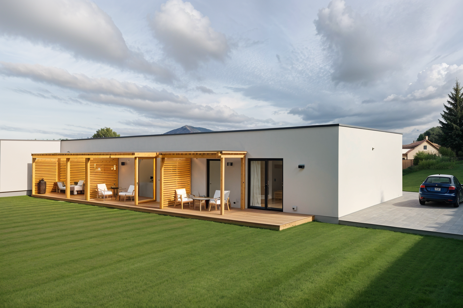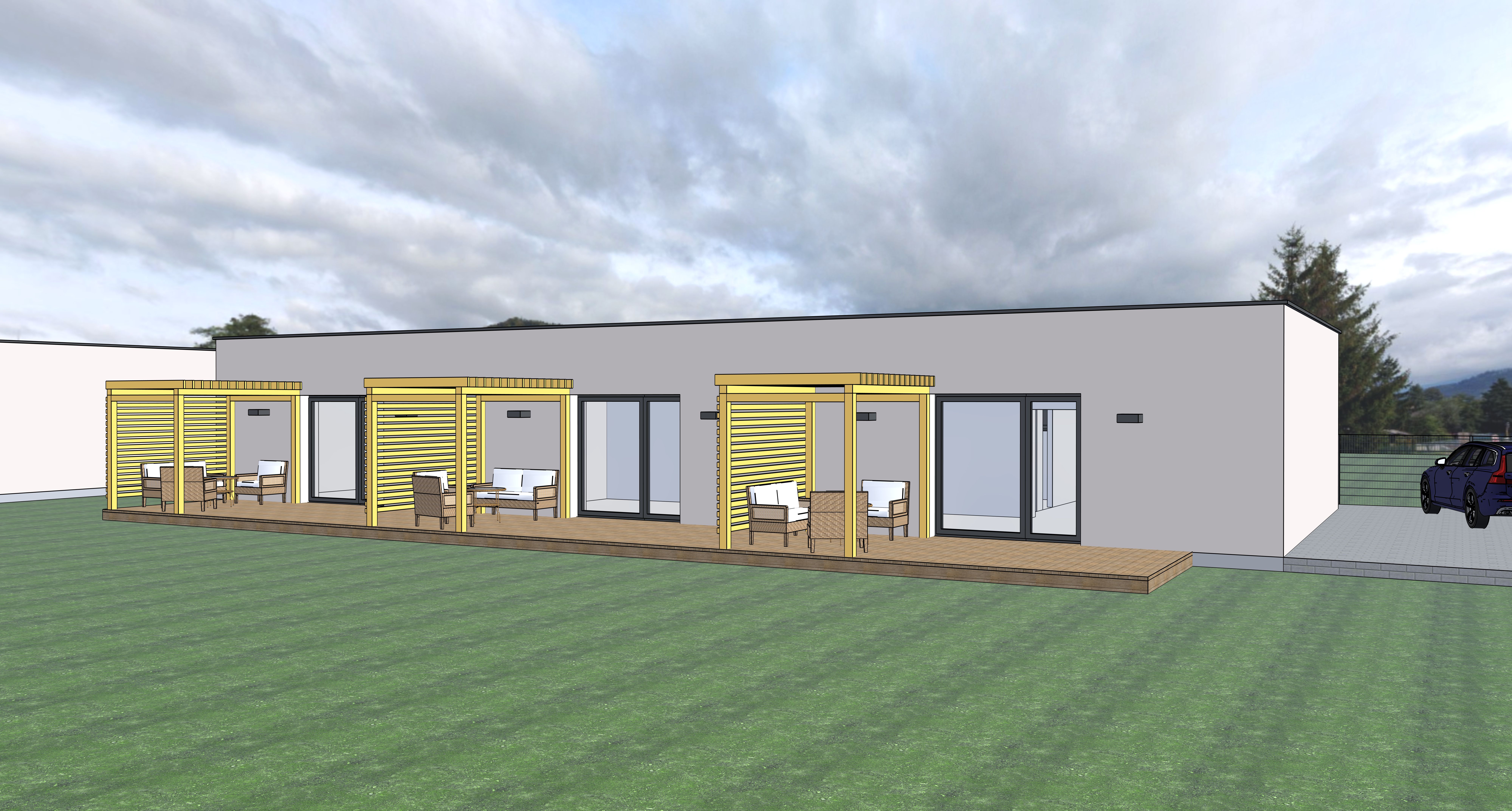 exterior shot d m se t emi byty spole nou terasou ale t emi stejn mi pergolami vedle v pozad je vid t je t kousek druh ho toho stejn ho domu mezi nimi je mezera asi 8 metr vstupn obr zek je sketchupov v stup p ekresli hrany do realistick ho vizu lu d ev n prvky pergoly vykresli v dez nu dub p rodn tr va m b t o 1 schod n ne zpevn n plochy prove ji realisticky p idej z hony s letn mi kytkami r ov ke e a 2 mlad jablon na nejbli terase sed mu a ena a pop jej kafe na obloze let pt k