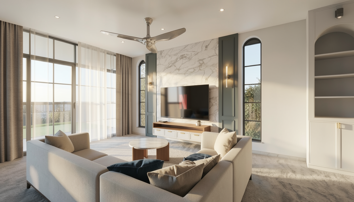 use glossy taj mahal marble for the flooring fill up the bookshelf on the right with books and some accessories and add led backlighting change fan to matt white finish