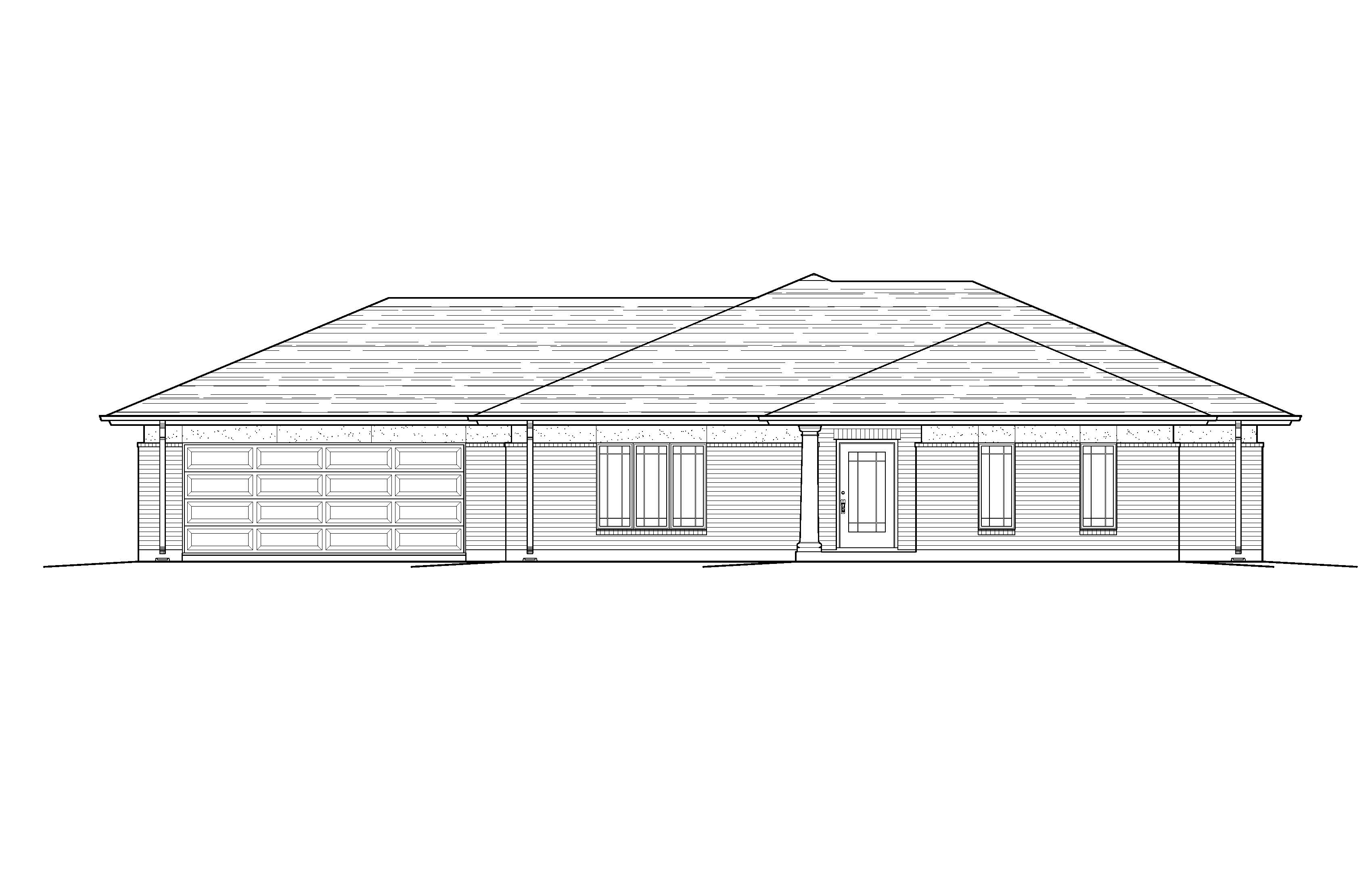 prairie style texas ranch land setting with foundation planting and wildflowers brown roman brick with cream color stucco band above no brick above windows cherokee red paint on doors windows fascia texas live oak trees in yard taper walk up to front porch gravel drive to garage door sunset with lights on snow