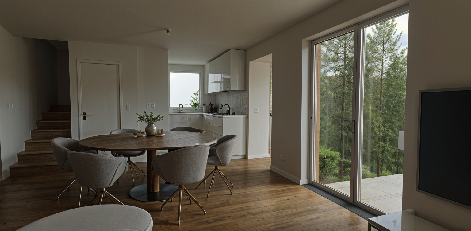 interior shot add a modern luxurious l shape kitchen with a serene and sophisticated atmosphere the room features sleek grey oak cabinetry the walls are clad in a soft cashmere hue appliances are seamlessly integrated adding a touch of contrast overhead lighting is warm and ambient creating a cozy yet refined ambience the flooring is herringbone parquet enhancing the airy feel of the space sparce greenery ads a hint of freshness while maintaining the minimalistic and clean design open the door and show part of a bed and a glazed door to a small garden