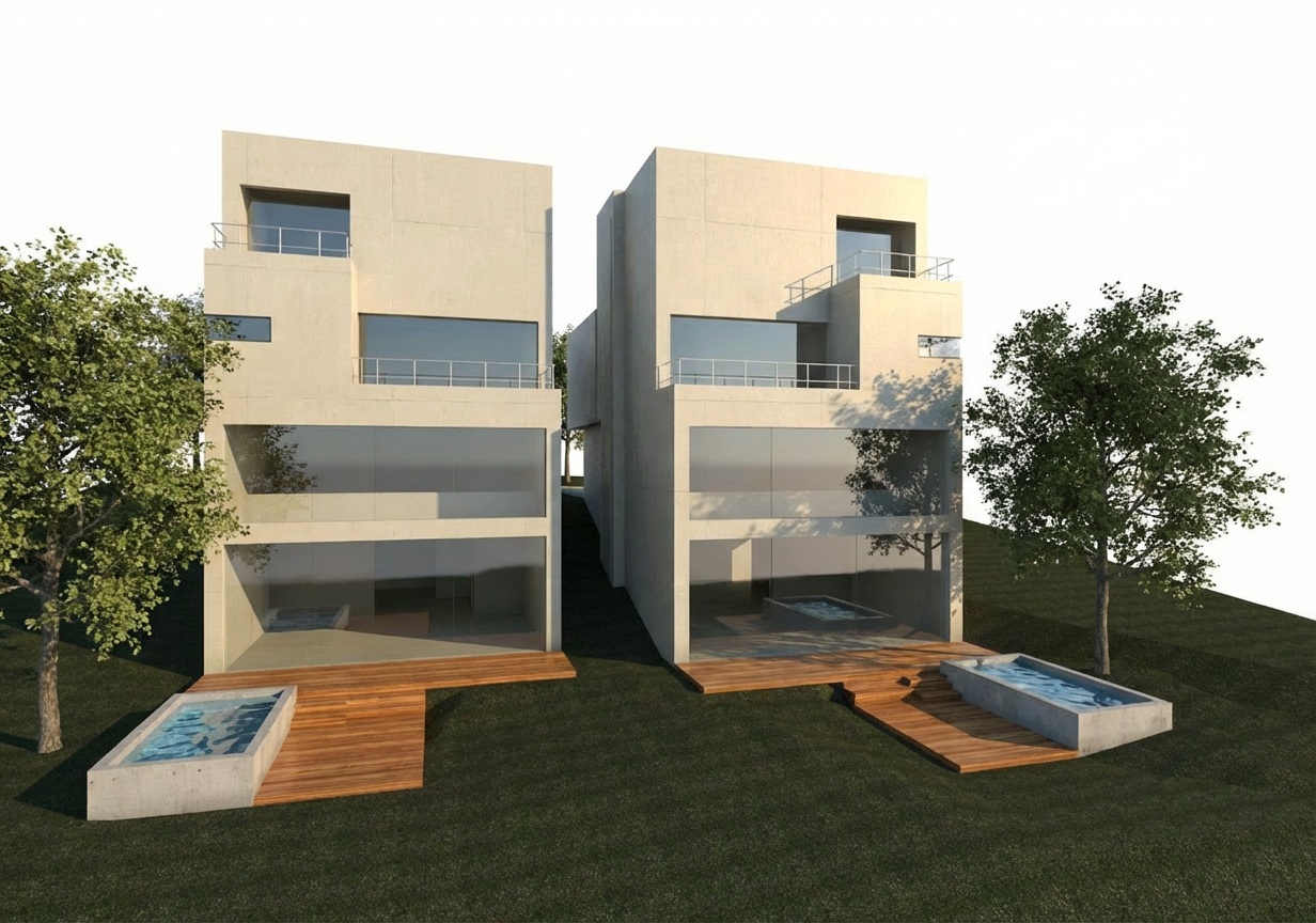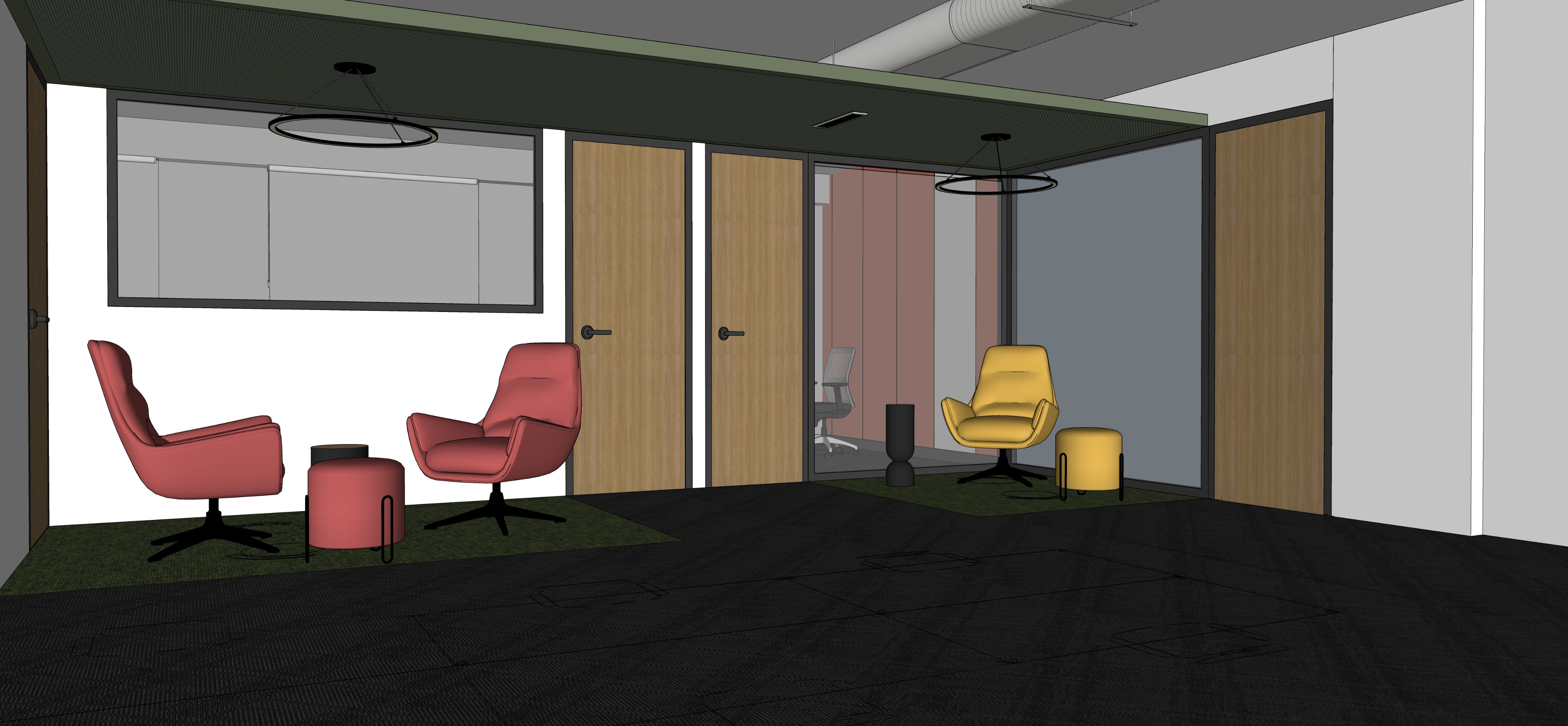 create a modern office interior with a sleek creative atmosphere include vibrant red lounge chairs and a round side table in the middle set against a dark green textured carpet add a mustard yellow chair and matching cylindrical table on the right design the ceiling with a soft olive green and incorporate subtle industrial elements like exposed piping use light wooden doors and accents for warmth contrasting with the smooth gray walls and tinted glass partitions ensure the lighting is soft and ambient casting gentle shadows and highlighting the vibrant colors and textures