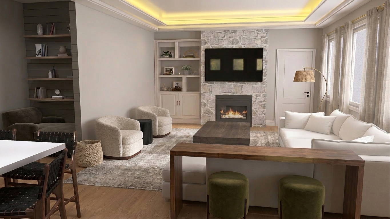 update the full l shape sectional to match the reference image and update the green ottoman style without the black legs slightly angle the olive green chaise tucked inside the shiplap reading nook to stick out past the nook match the reference image floor lamp and console table style