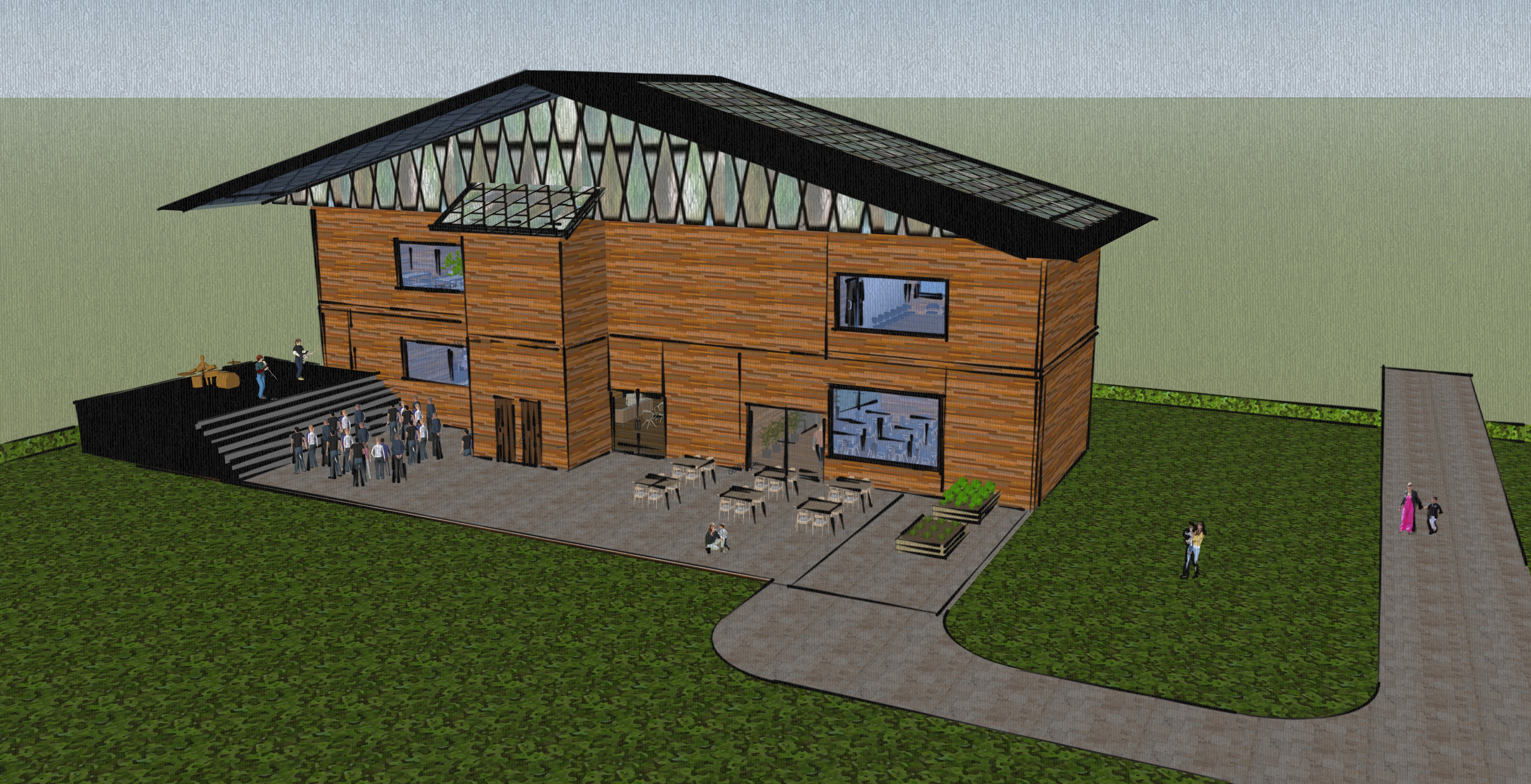 aerial shot make the building wood grain colors and the space around the model with green elements and green trees architecture