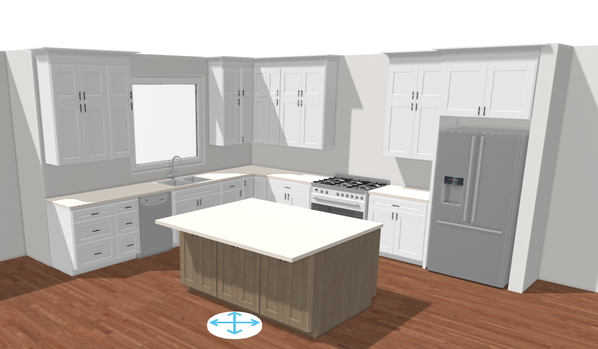 cabinets should be a modern shaker style upper cabinets are 48in tall with sub crown and cove crown that fills the remaining 6in to the ceiling all the upper cabinets should have full height doors rather than stacked use 6in matt black handles for all the cabinets add a nice modern wood hood over the range that matches the stain of the island cabinets the ceilings are 108in tall and there are 3 hanging pendant lights over the island the setting should be early morning