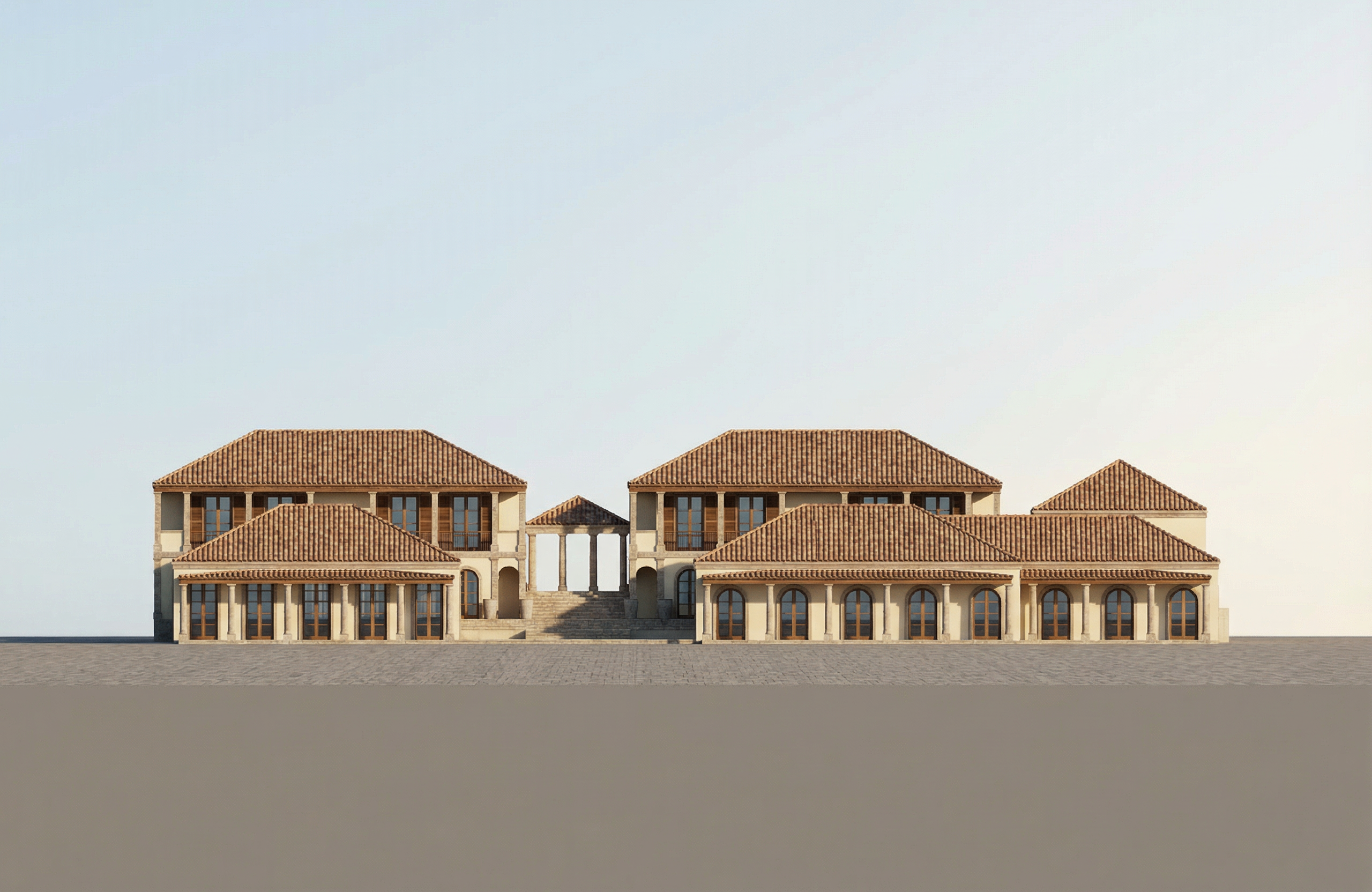 create an artist imperssion with planting to the outer edge of the grassed areas light grey windows and doors light rustic red roof pan tiles concrete pin curb edges to the road side set at same level because it shared surface light cloudy sky summer golden hour