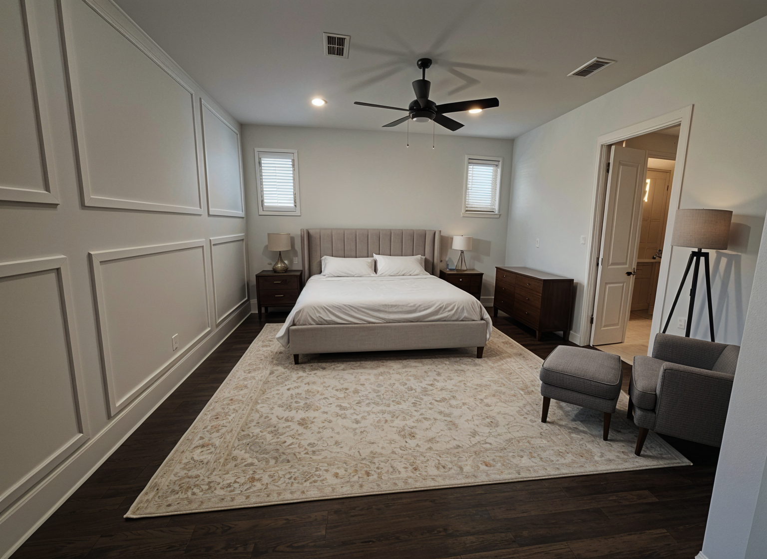 add a slat wall to the back wall add a beige bed and paint the back wall beige and add a bench at the foot of the bed