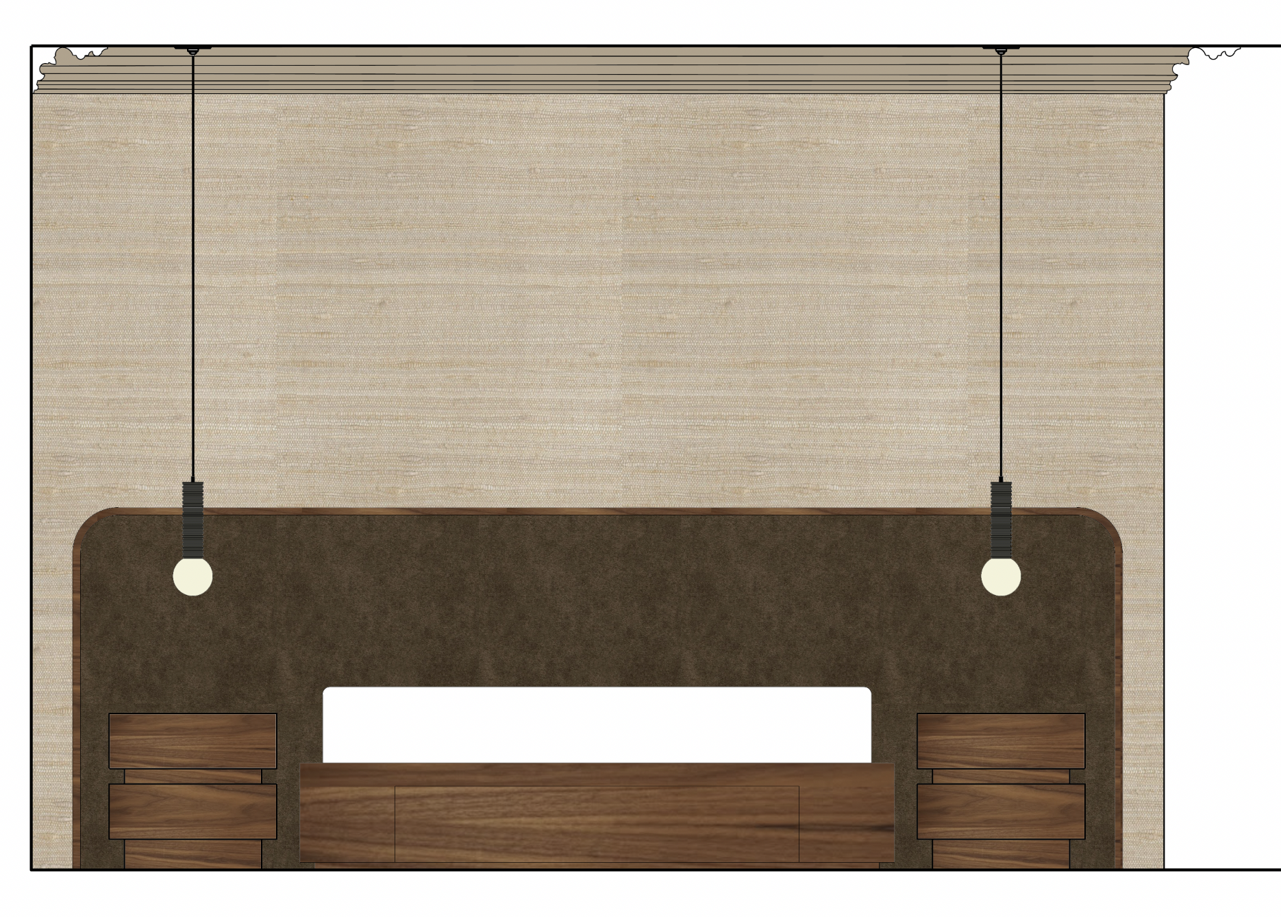 primary bedroom texture silk beige wall covering as shown brown velvet upholstered headboard with walnut wood border as shown walnut night stands as shown low profile walnut platform bed as shown black leather wrapped ribbed pendants as shown