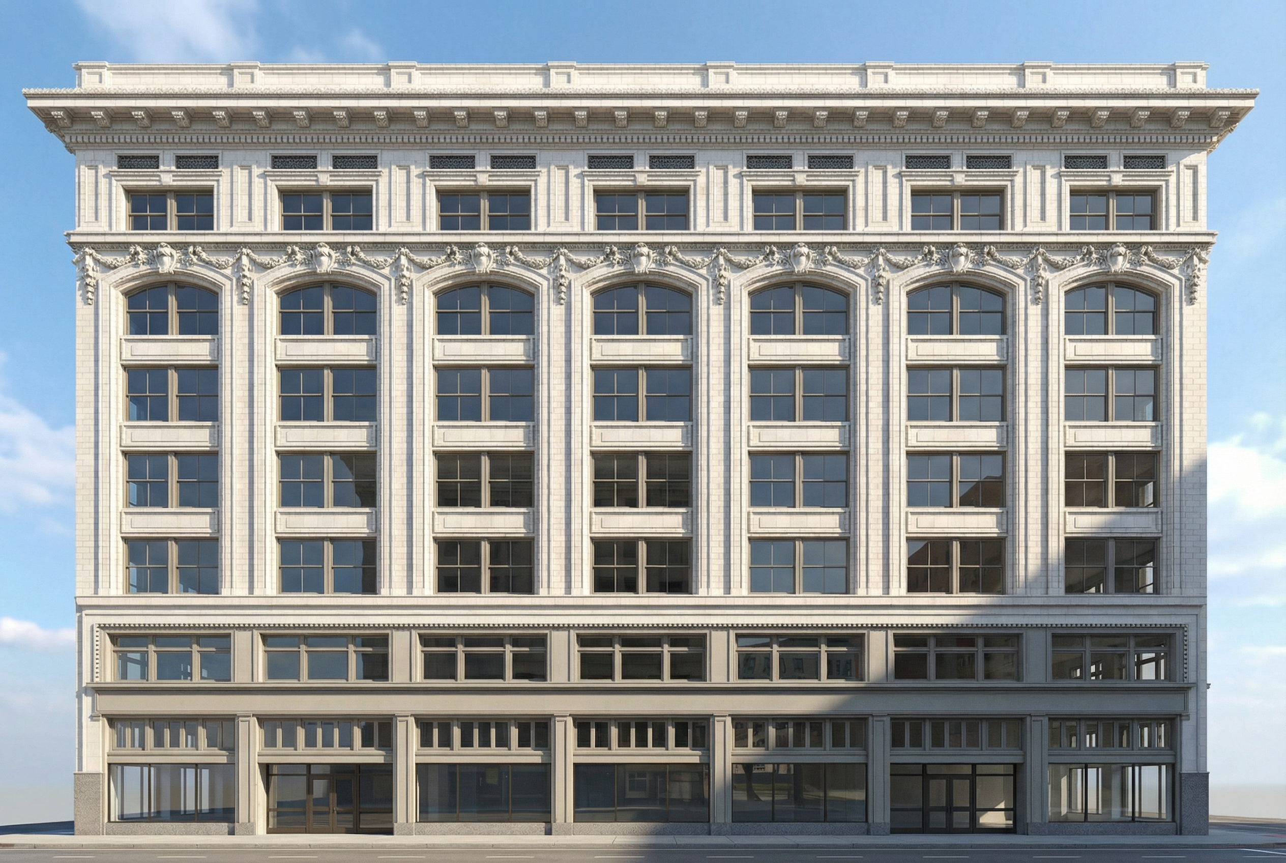 convert this photograph into a precise architectural elevation of the historic building preserve every fa ade characteristic exactly as shown all window proportions mullion patterns stone detailing cornices pilasters ledges storefront frames and material textures do not modify simplify or reinterpret any architectural elements correct the perspective to a true orthographic elevation while maintaining the exact geometry spacing and vertical horizontal alignment of the existing fa ade remove street elements cars signs and surrounding buildings so the elevation shows only the historic building itself maintain original material realism stone texture shadow depth window reflectivity and aging patterns produce a clean high resolution elevation suitable for architectural documentation and presentation boards