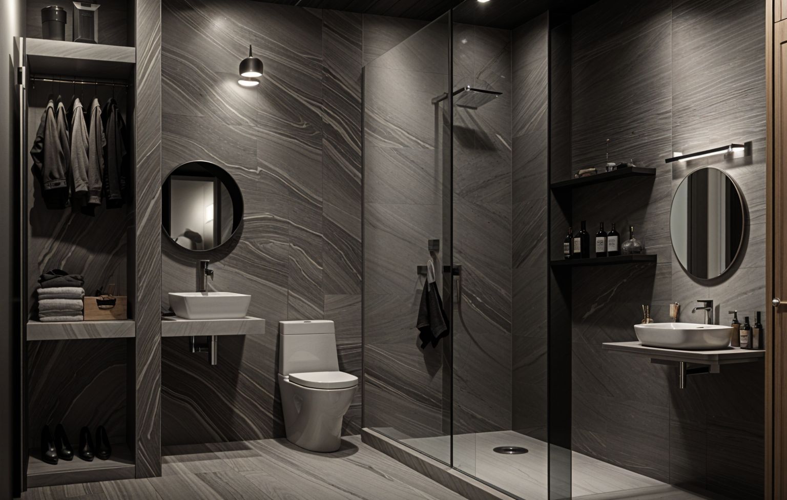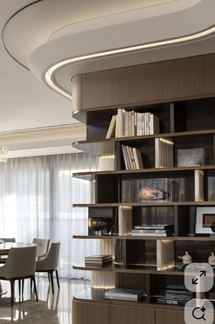 interior shot warm lighting hanging light tropical feeling greenery on top matt materials