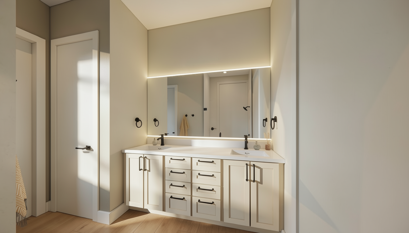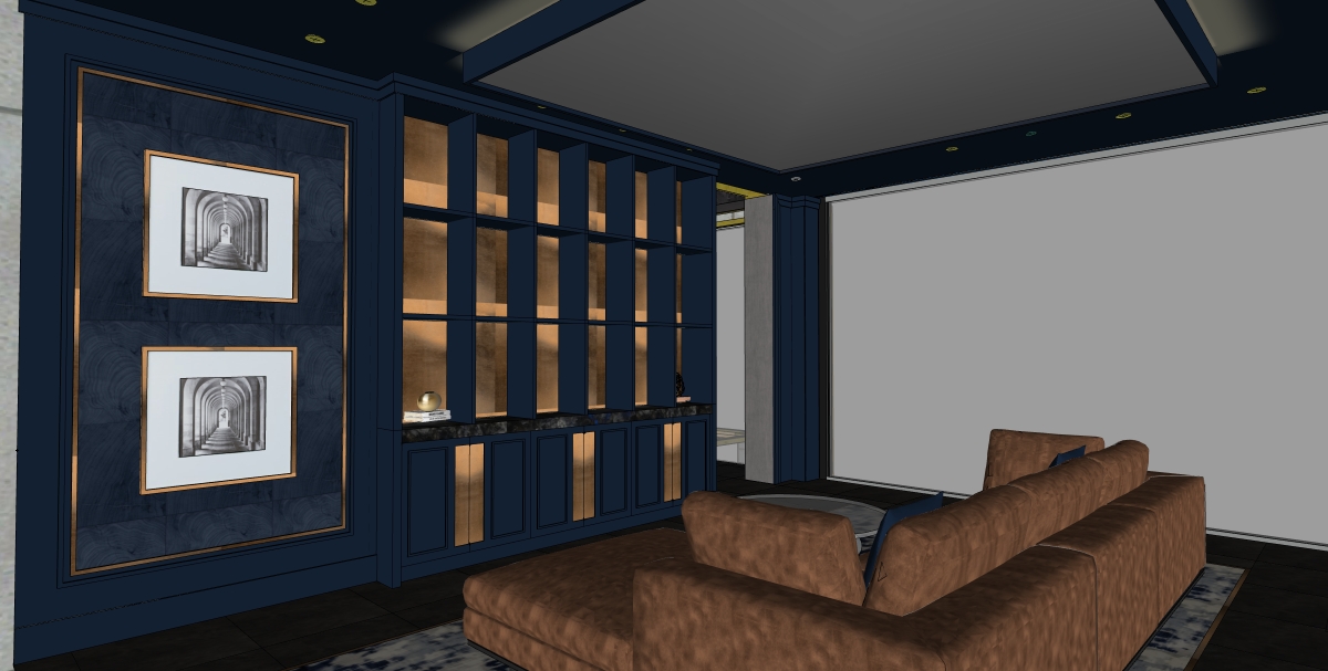 dusk waterfront view sarasota fl soft accent lighting in shelves camel leather sofa black and white photos in frames accolades on shelving mirror on underside of drop ceiling structure maintain deep blue color on walls and cabinets with gold accents moody library vibe recessed lights in ceiling to provide ample light in space entire left side wall is large seamless glass window maintain shelving structure as is