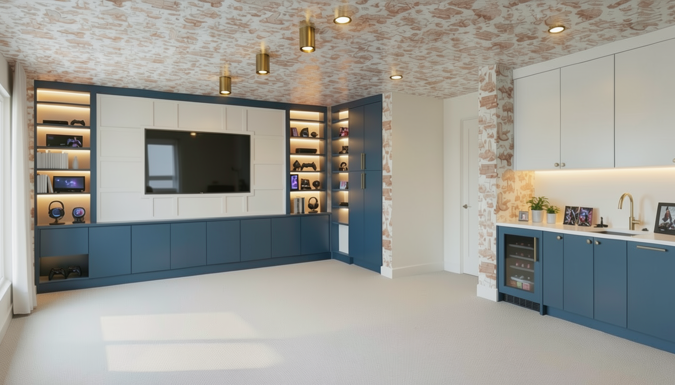 update the rendering with the following architectural changes while keeping the cabinetry style and materials consistent modify the corner shelving so the floating shelves wrap the corner the shelves should continue from the left shelving unit and turn the corner onto the adjacent wall creating a continuous l shaped floating shelf detail the shelves should stop when they meet the tall blue tower cabinet reposition the brass ceiling light fixtures so they are centered over the tv wall arrange the fixtures in two rows so they split the center line of the tv creating a balanced layout aligned with the tv feature wall add soft integrated led backlighting around the tv wall panel the tv panel should be slightly recessed from the surrounding millwork so the backlighting creates a subtle glow around the perimeter the recess should be shallow less deep than the open shelving recess the small element in the lower right corner should be integrated into the cabinetry extend the base cabinetry so this area becomes part of the cabinet run with matching doors and finishes maintain the wallpaper wrapping from the ceiling down the walls and keep the illuminated gaming accessories on the shelves improve photorealism with natural daylight warm interior lighting realistic shadows and accurate material textures