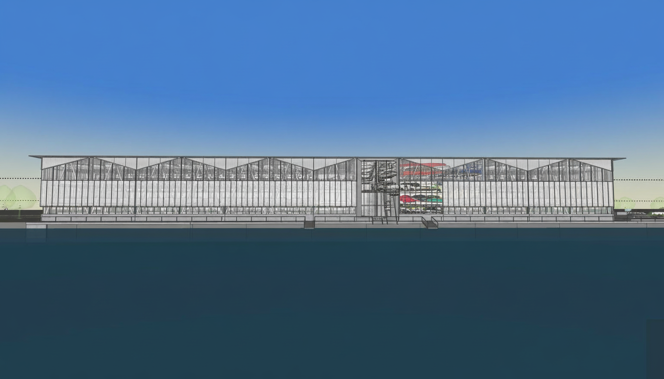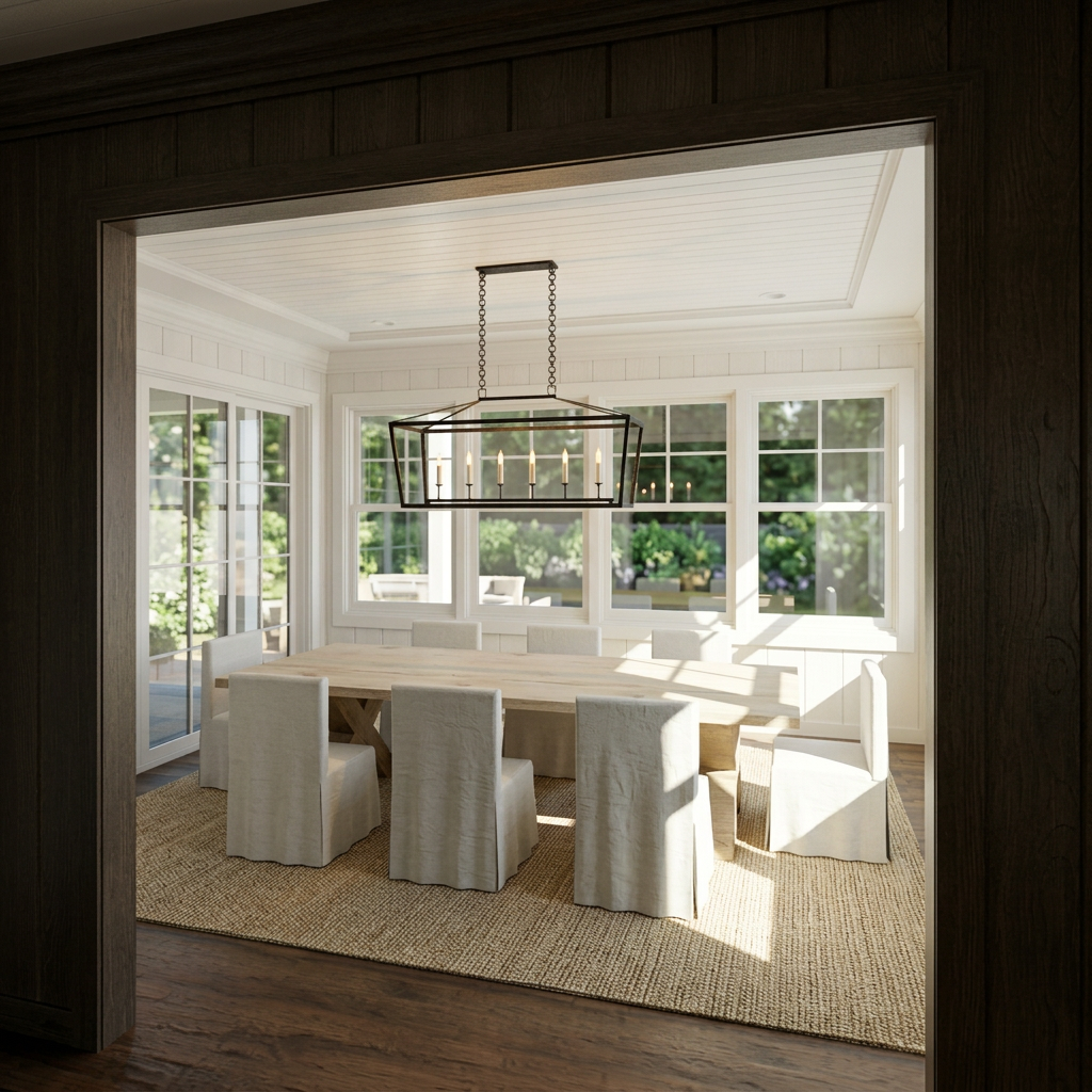 a modern architectural house nestled in a serene forest setting the house is constructed with warm earthy red and brown brick featuring large geometric windows that reflect the surrounding nature the roof and accents are a cool muted gray brown the foreground is a mix of lush green shrubs and dried grasses creating a natural texture the background is an array of leafless trees with dark bark adding a sense of depth and tranquility the sky is partly cloudy with soft whites and patches of vibrant blue casting a gentle diffused light over the scene suggesting a peaceful afternoon ambiance