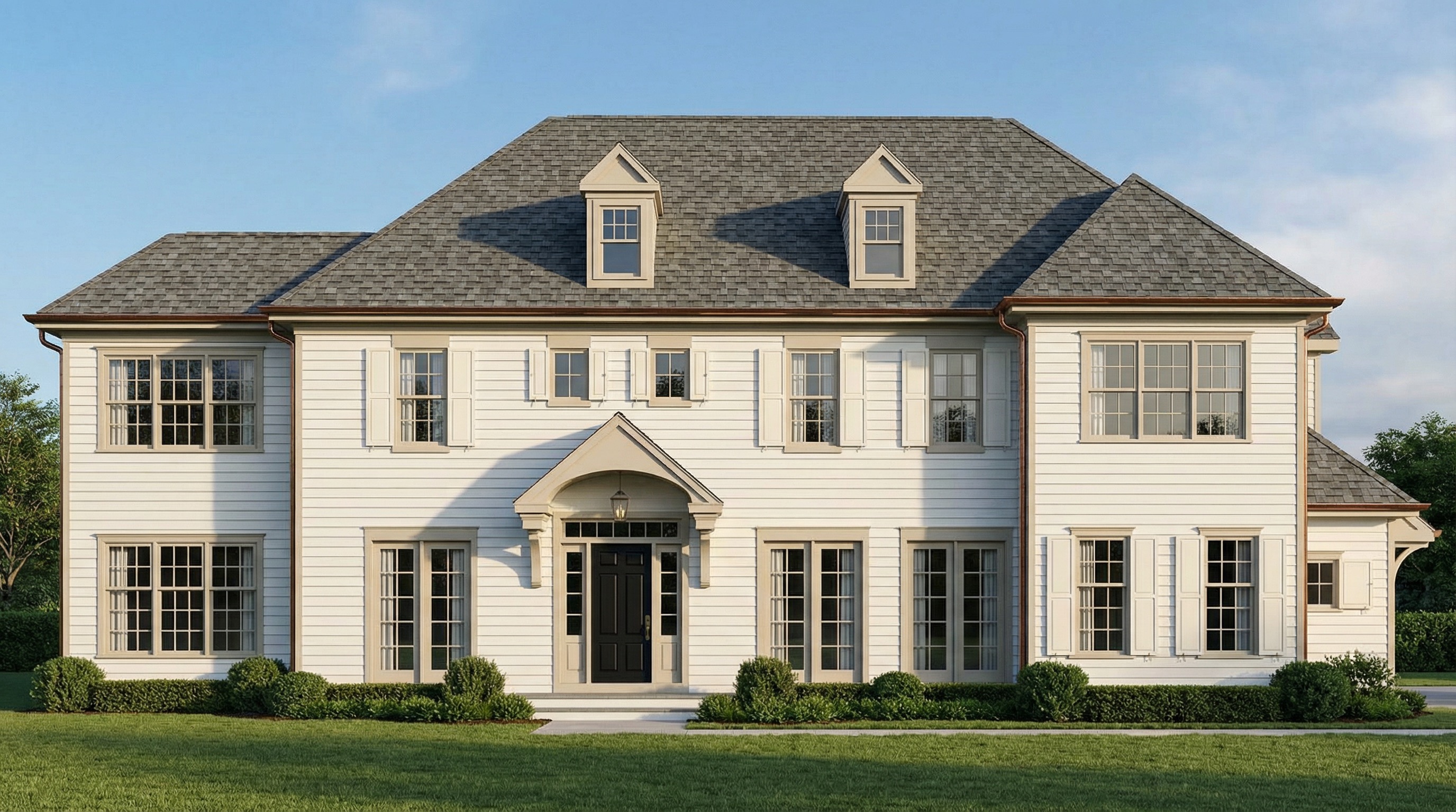 using the provided rendering as the base image maintain the overall architecture and massing of the house update the exterior to feel more current and refined while keeping a traditional estate style replace cedar shingles with smooth warm white horizontal siding simplify window trim and reduce decorative shutters introduce paired window groupings on key areas of the fa ade add subtle dark accent siding panels in deep charcoal or slate blue on secondary masses add standing seam metal roofing accents on small roof elements such as the entry canopy or secondary gables update the front entry canopy with cleaner architectural lines and slightly larger structural elements for a more contemporary appearance maintain oxford gray roof shingles and the black front door