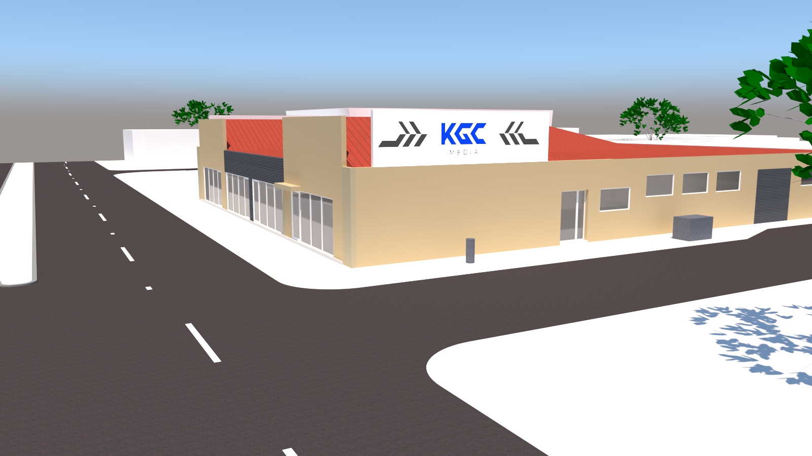 exterior shot a modern commercial building with a beige exterior featuring a red roof the large sign is prominently displayed in blue and black adding a touch of contemporary style windows are set with clear glass and an adjacent road is neatly paved with smooth black asphalt and white lane markings surround the scene with a bright blue sky and a few lush green trees to create a sunny welcoming atmosphere architecture
