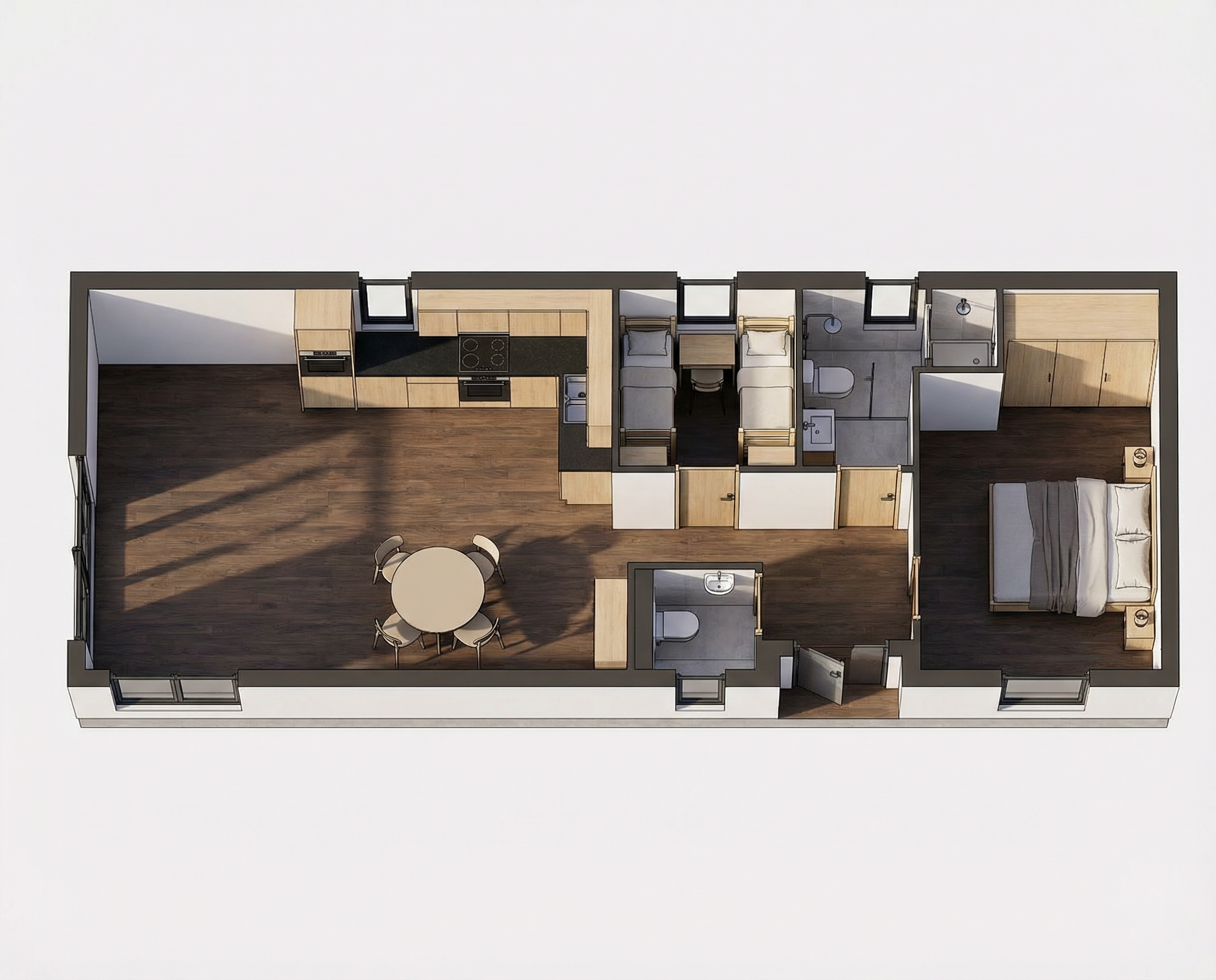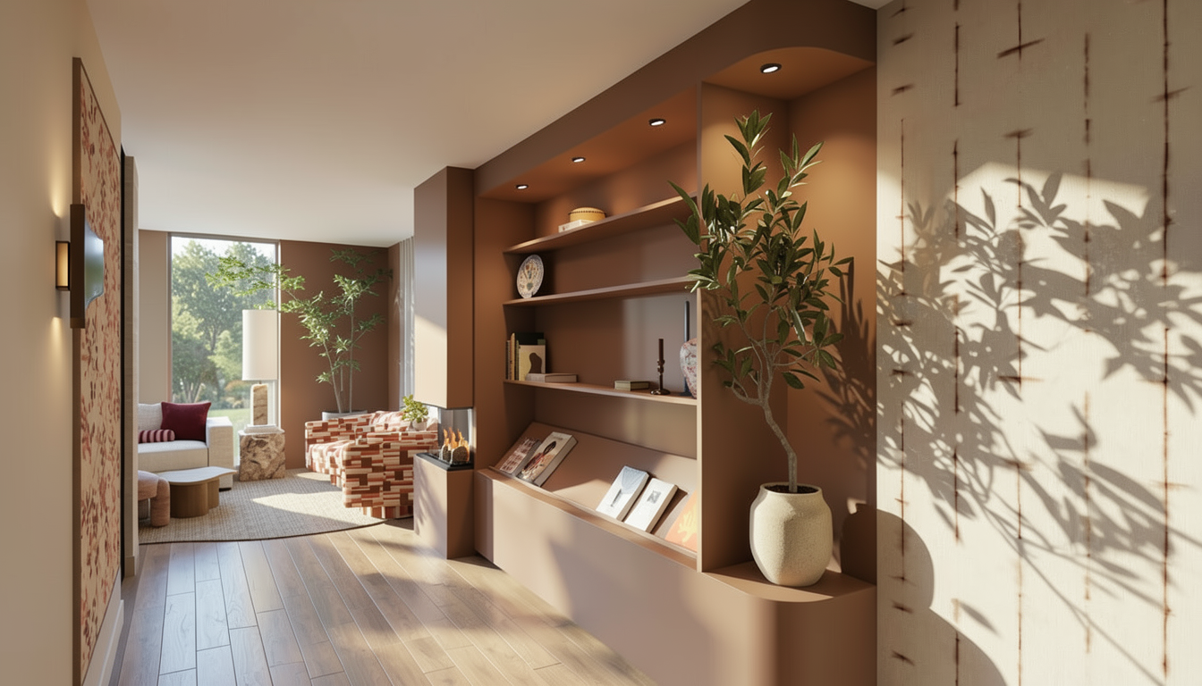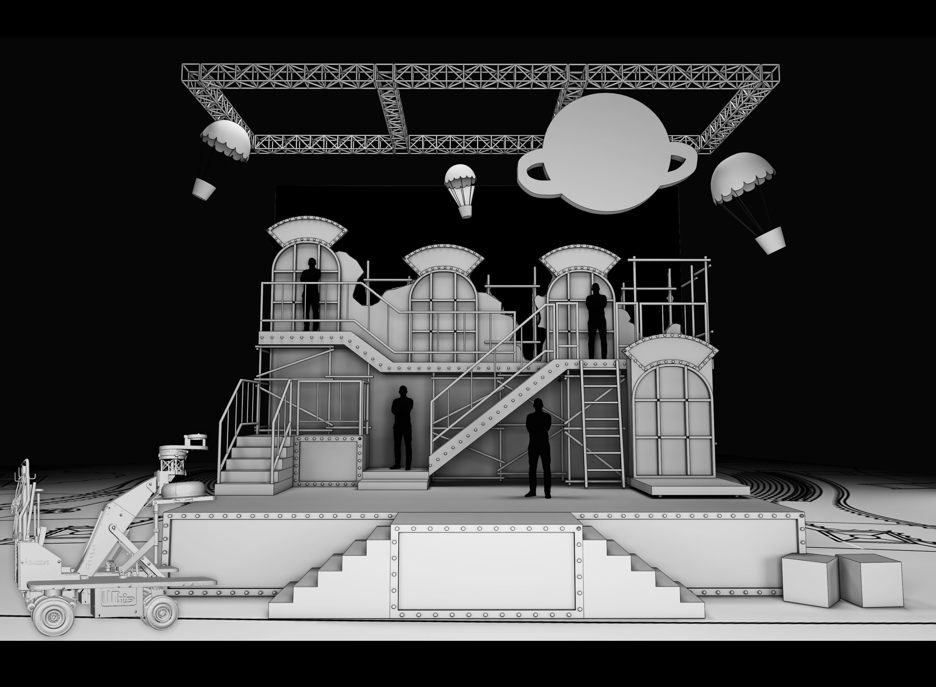 sky cyclorama painting behind broken brick walls and window frames with a half drawn curtains with red and white stripe it should feel old hollywood sound stage interior and old style lightings ropes ladders and props are placed on the stage some of the lightings shoot light beam toward the stage