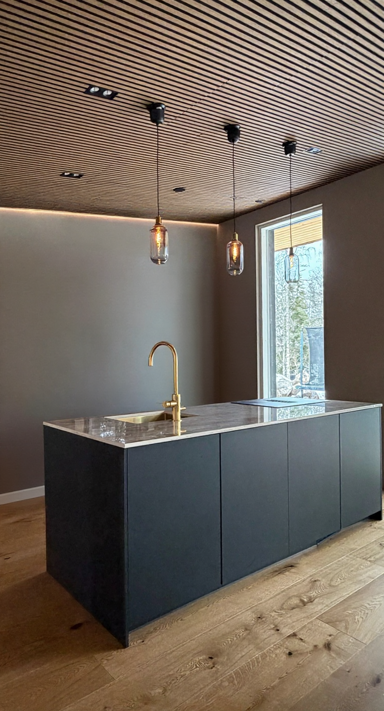 a modern kitchen design with clean lines and a minimalist aesthetic the cabinets are a soft beigh color creating a warm and inviting atmosphere the countertops are a sleek white marble that adds a touch of elegance the shelves in the inside have a rich walnut finish and a dark glass in the outside with antracid alumin surounding it providing a beautiful contrast and a natural element the floor is a light gray tile offering a neutral base large windows let in natural light enhancing the spacious feel the overall atmosphere is serene and contemporary perfect for a stylish and functional kitchen space do not change the colors of the design
