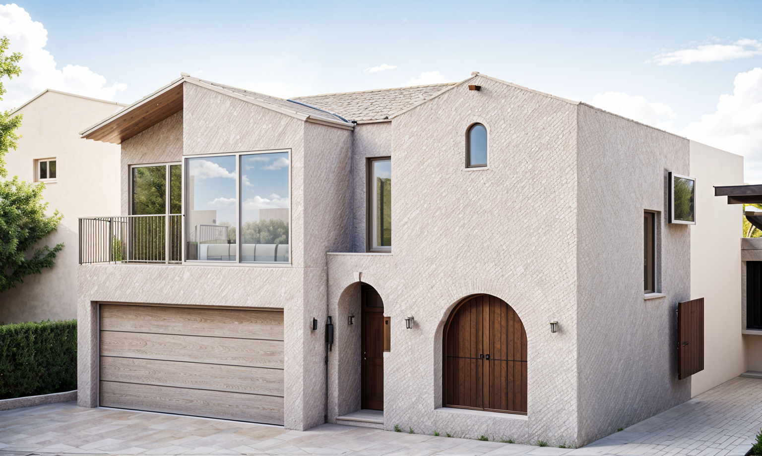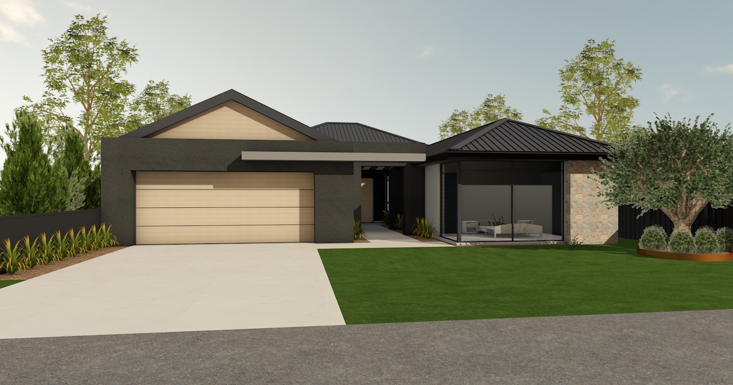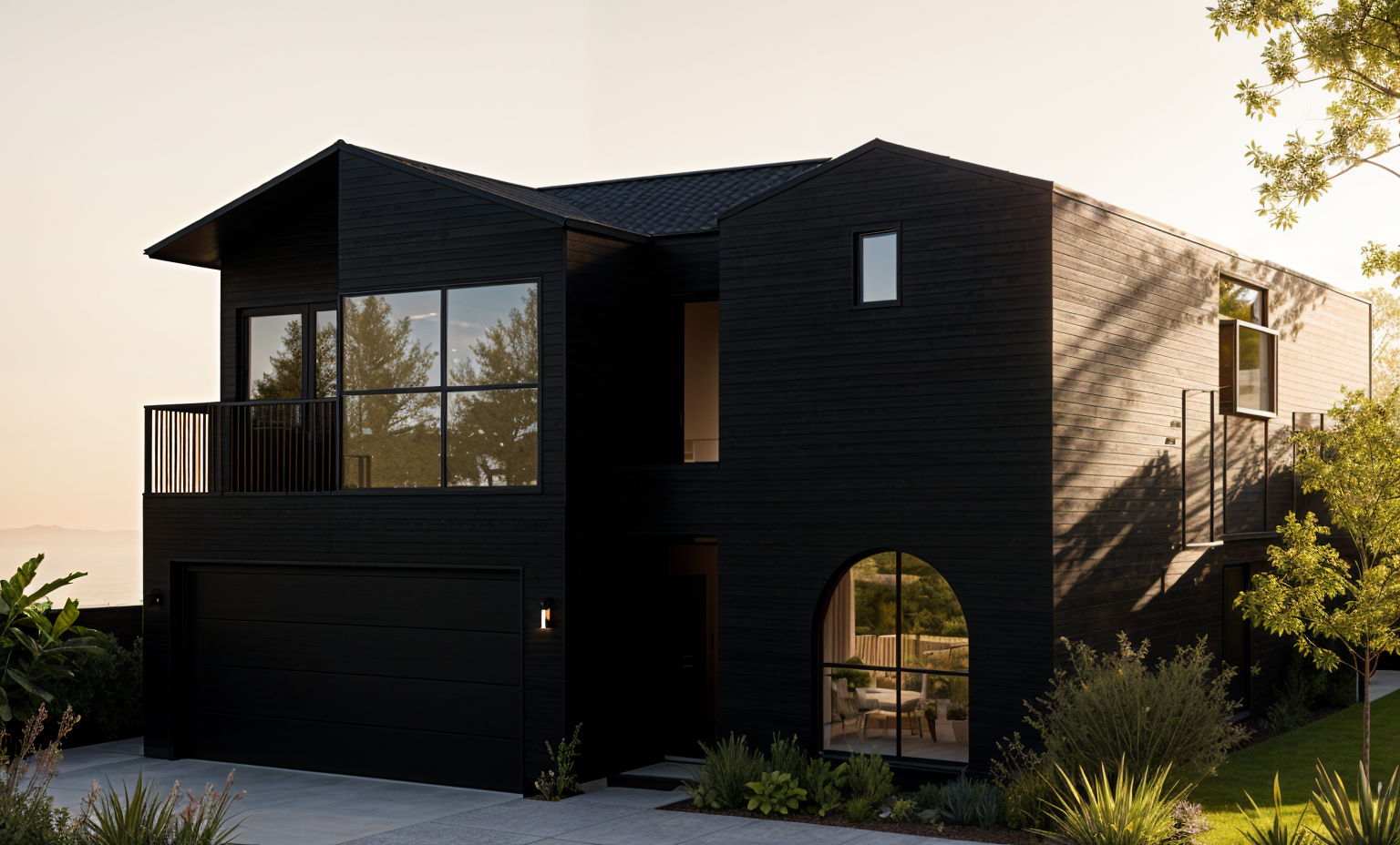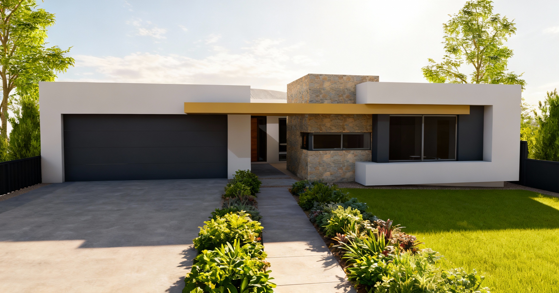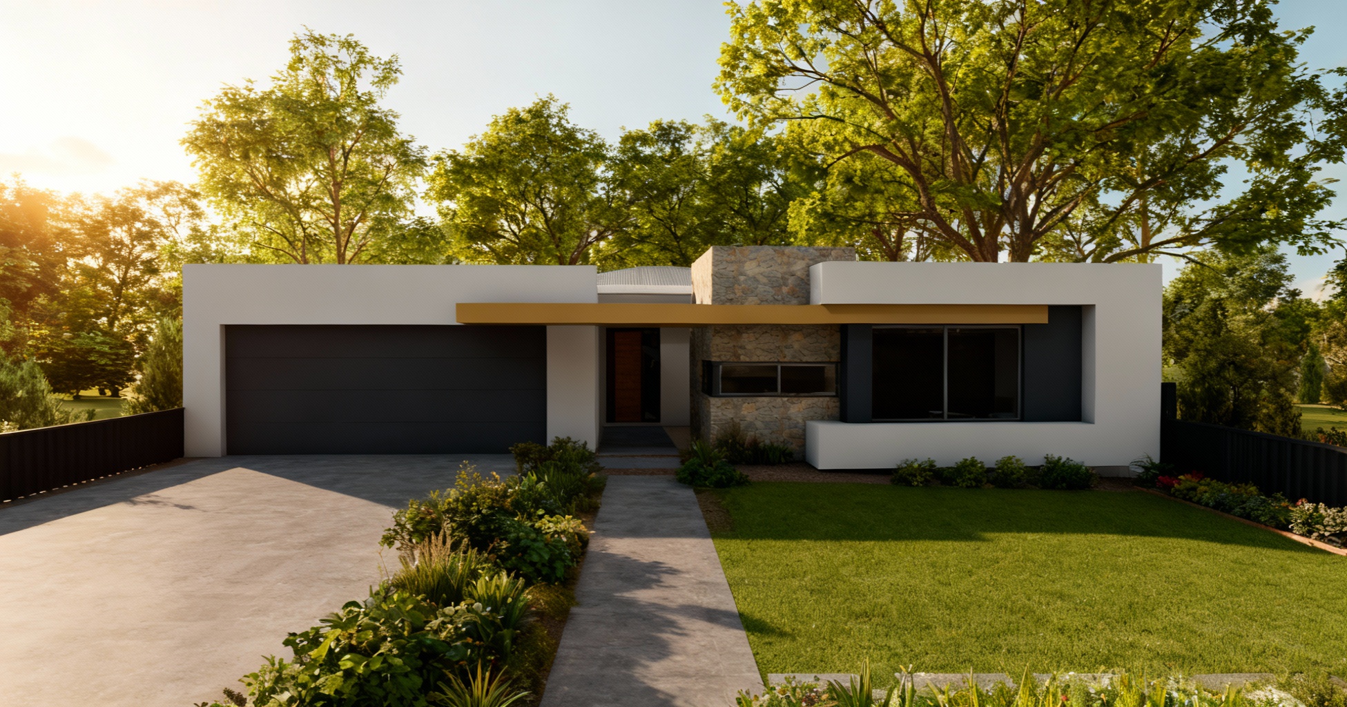 sunny afternoon in lush green trees heavy gardens along footpath to front door courtyard black garage door
