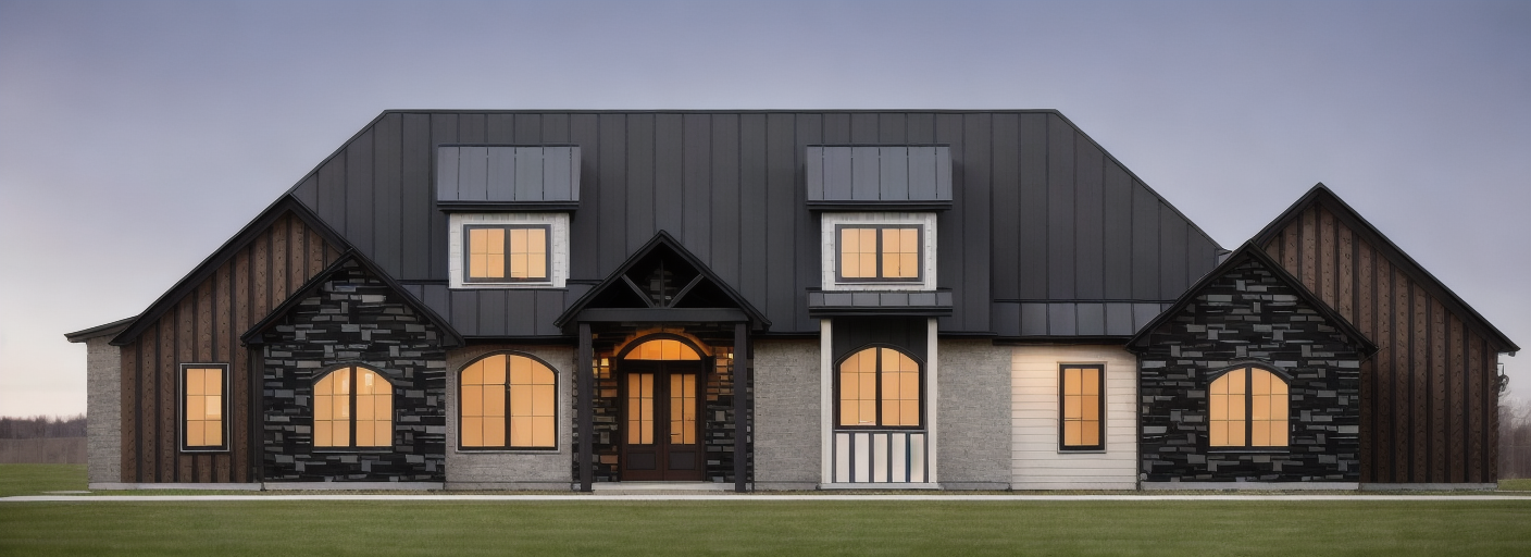 prairie style exterior shot exterior modern farmhouse with black roof black windows black board and batten siding brown wood timbers dark brown horizontal siding white stone white stucco architecture