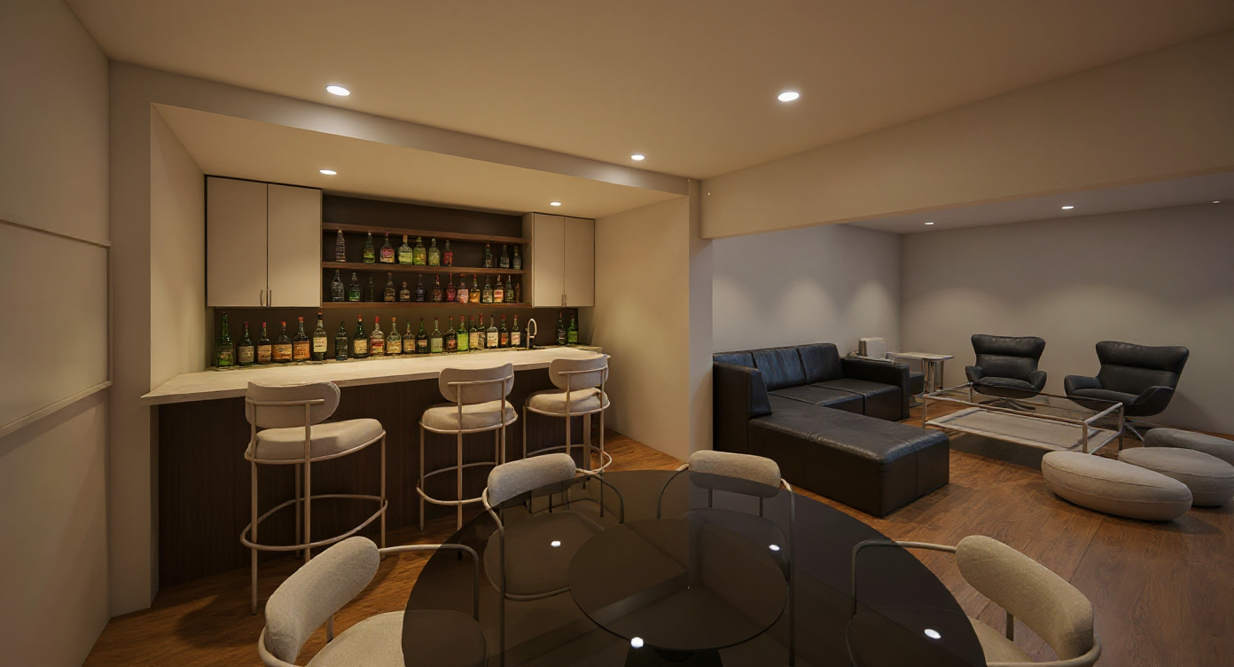 photorealistic image bright bar and lounge space add bar glass and liquor to counter and shelves dark brown leather couch with cloth upholstered chairs and poufs wood cabinets with light highlighting bar and liquor bottles add pillows and a blanket to the sofa and lounge chairs white paint on walls