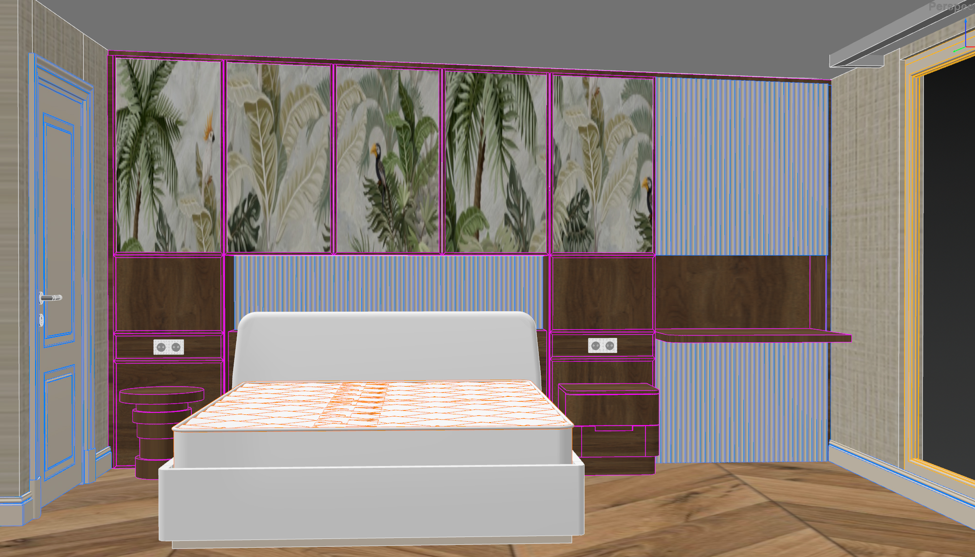 there is an led above the headboard pointing towards the ceiling there is an led under the upper right cabinet add bedding and pillows to the bed ceiling spot lighting the wood tone should be light colored