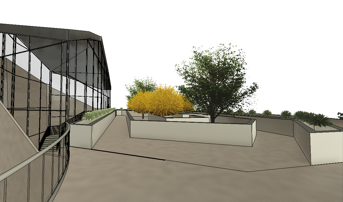 exterior shot front view of a modern architectural exterior with a steel and glass facade in sleek silver and reflective tones surrounding the building a landscaped area with lush greenery including deep green pines and vibrant yellow autumn trees the ground is paved in warm beige bordered by clean minimalist white concrete walls bright sunny atmosphere with clear blue sky casting soft natural shadows throughout the scene
