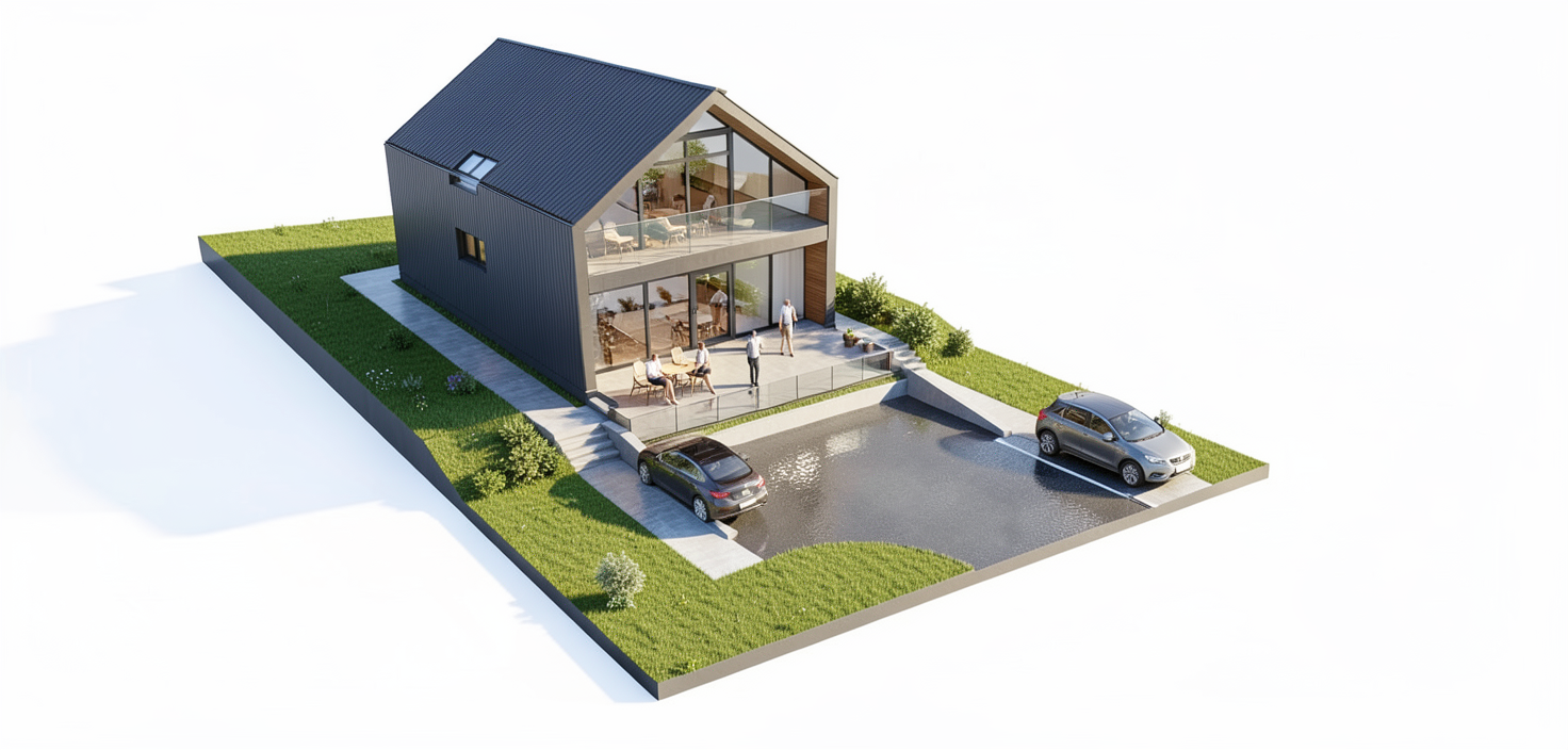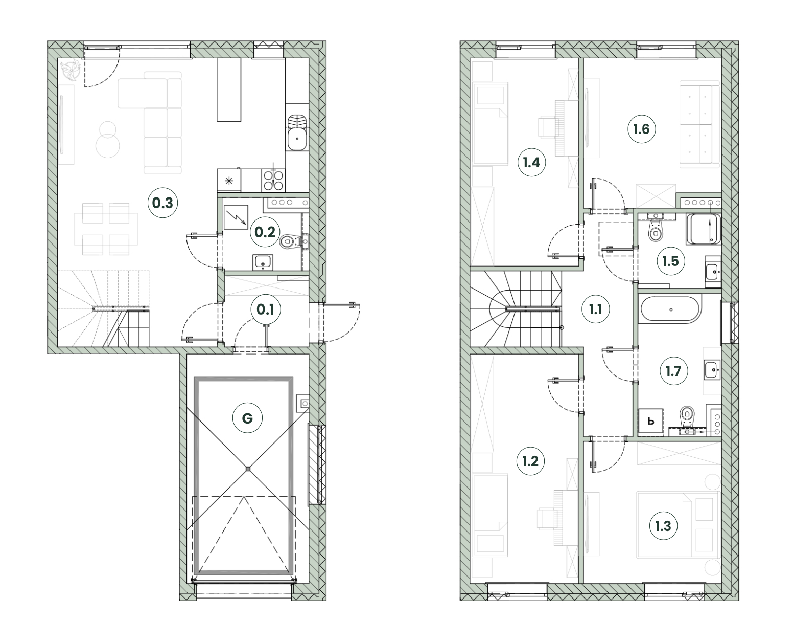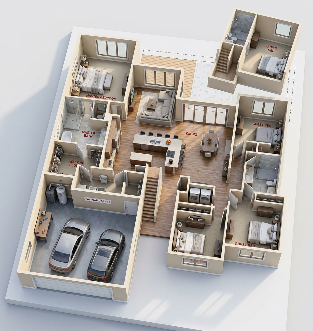 convert this floor plan into a realistic isometric 3d view of a full house show the space from an elevated angle with furniture walls and details visible modern minimalist design wood light colors use the same furniture as shows on the plan do not change the orientation of the floorplan