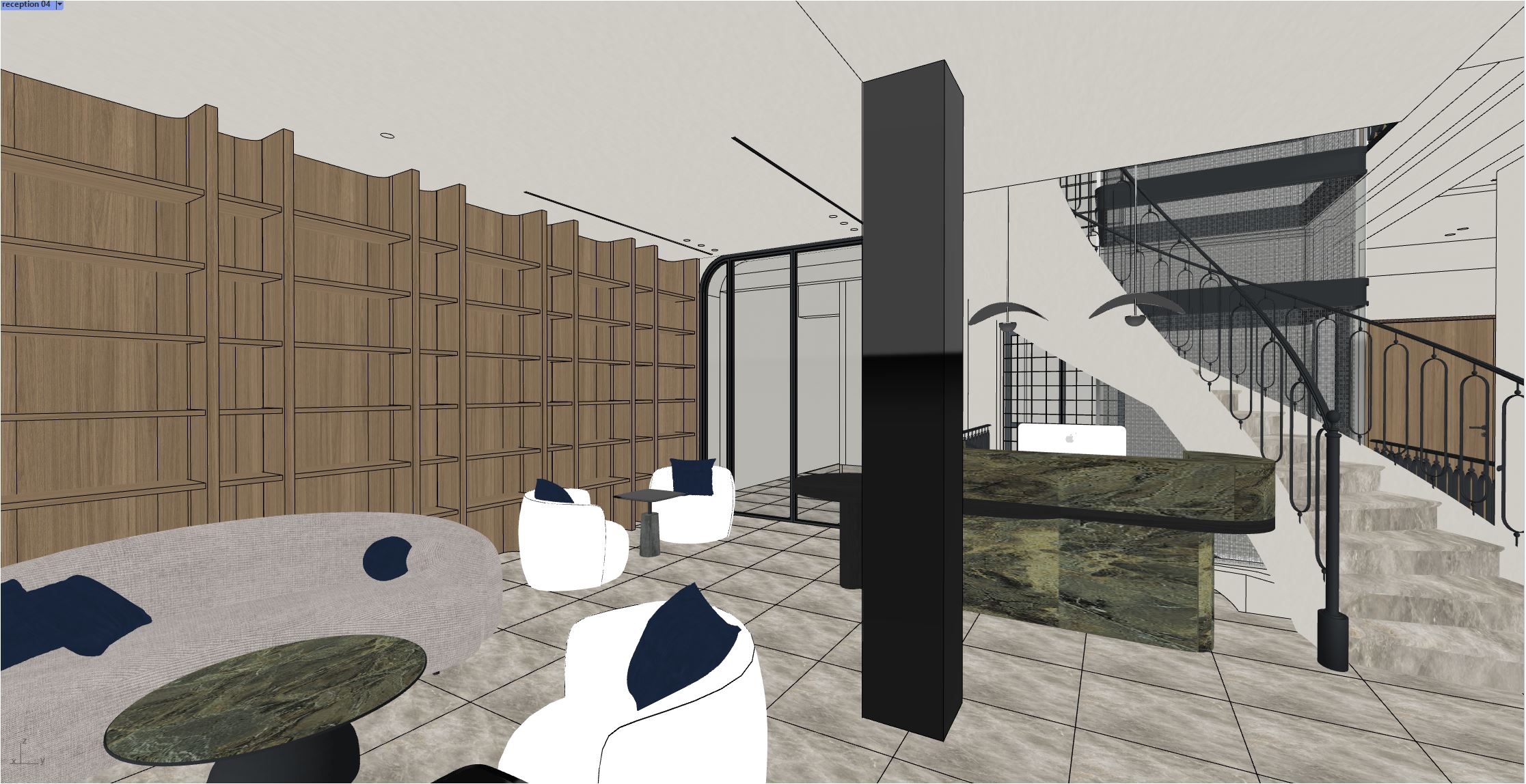 create a realistic high resollution materials image do not redesign the geometries or styles nice grey marble floor do not add extra spots or linear leds create physical light inserts from outdoor midday daylight at the left there is a metal glass door with plise glass green marble reception switch on lights give boutique hotel atmosphere add books in the bookcase and horizontal led lights and decorative items on tables the black lines on the ceiling are not lights they are linear slim slot black rails for airconditioning