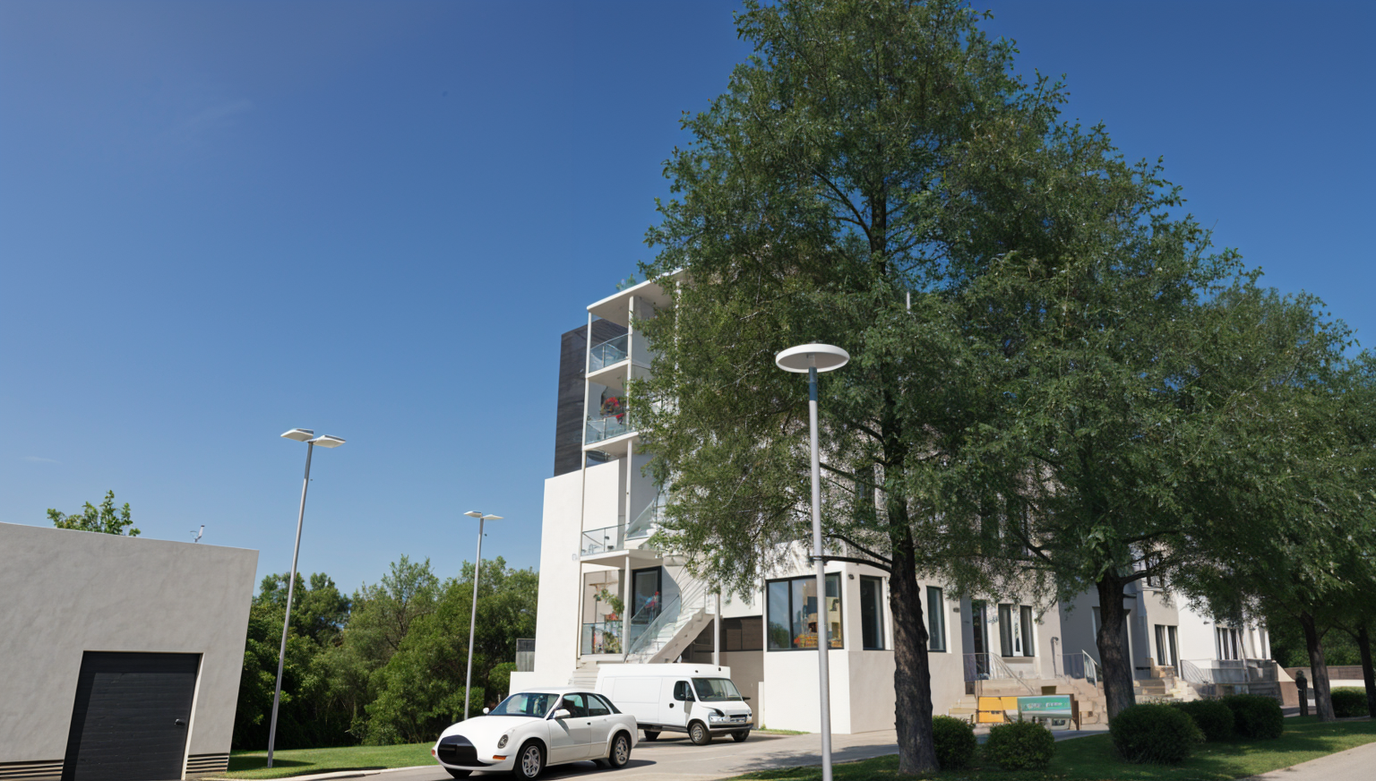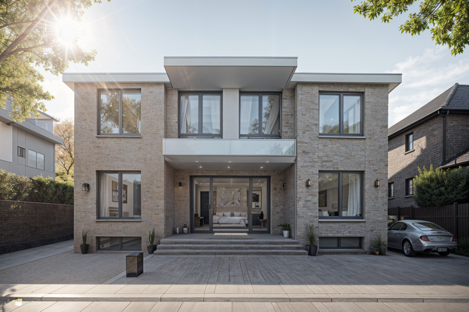 contemporary exterior shot keep the same materials and show nice landscape on the front architecture