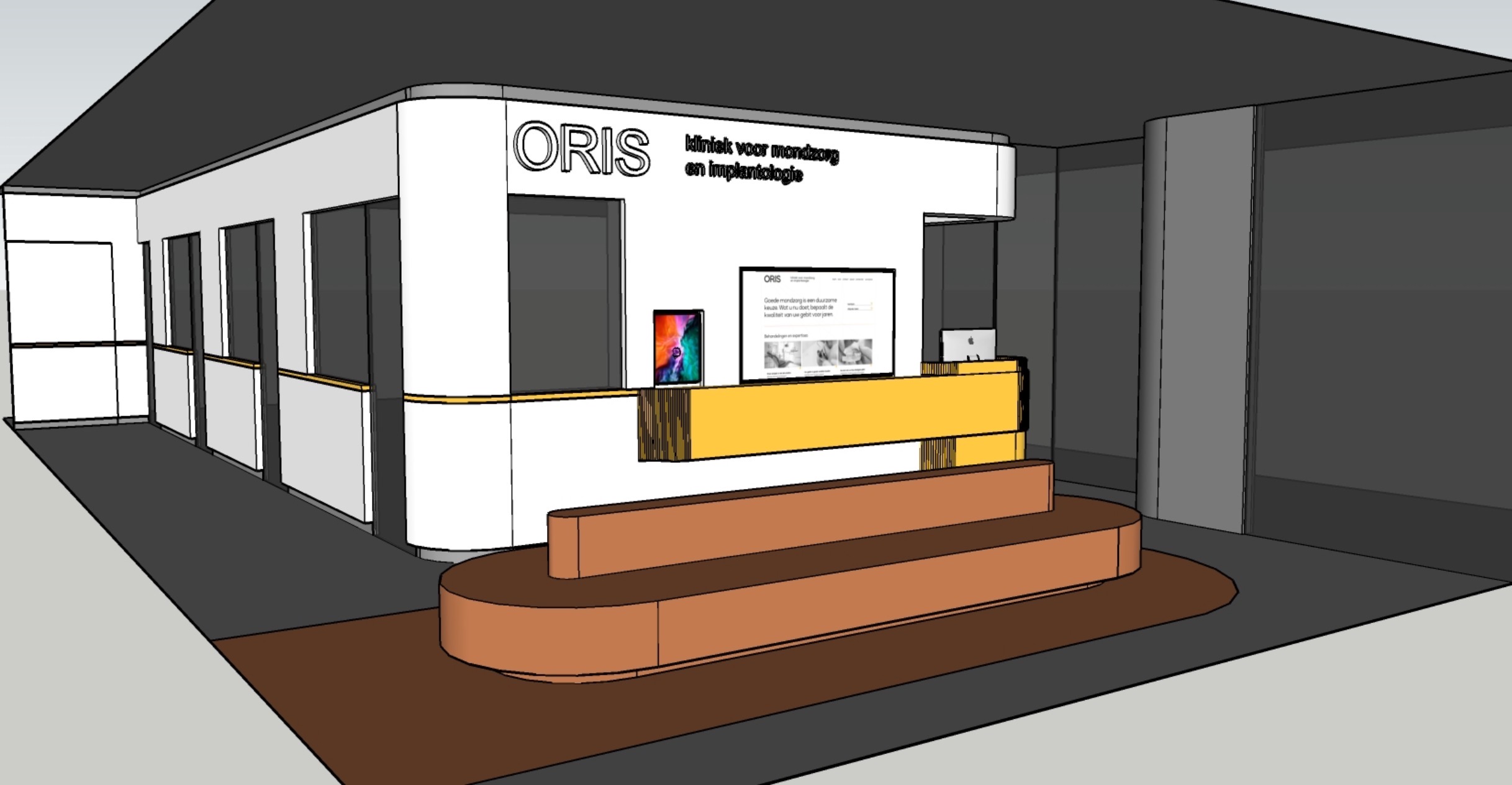 de witte wanden zijn solid surface naadloos verlijmd met de okergele streep en balie dit voor een high end uitstraling deze meubelwanden zijn voorzien van terugliggende onder en bovenplint met lichtdetail voor zwevend hangend effect plafond zal grijs spuit stuc plafond worden alle andere wanden waarschijnlijk ook zelfde grijstint als in de gietvloer zodat alle grijze tinten in elkaar overlopen monocolorestijl onder de wachtbank zit zelfde kleur als bekleding stoffering als bank ook voor monocolorestijl onder de bank is dus vloerbedekking voorzien in zelfde tint wat ingelegd zal worden in de gietvloer voor glad geheel alle ramen zijn rookglas ramen voor luxe uitstraling en deels ook privacy