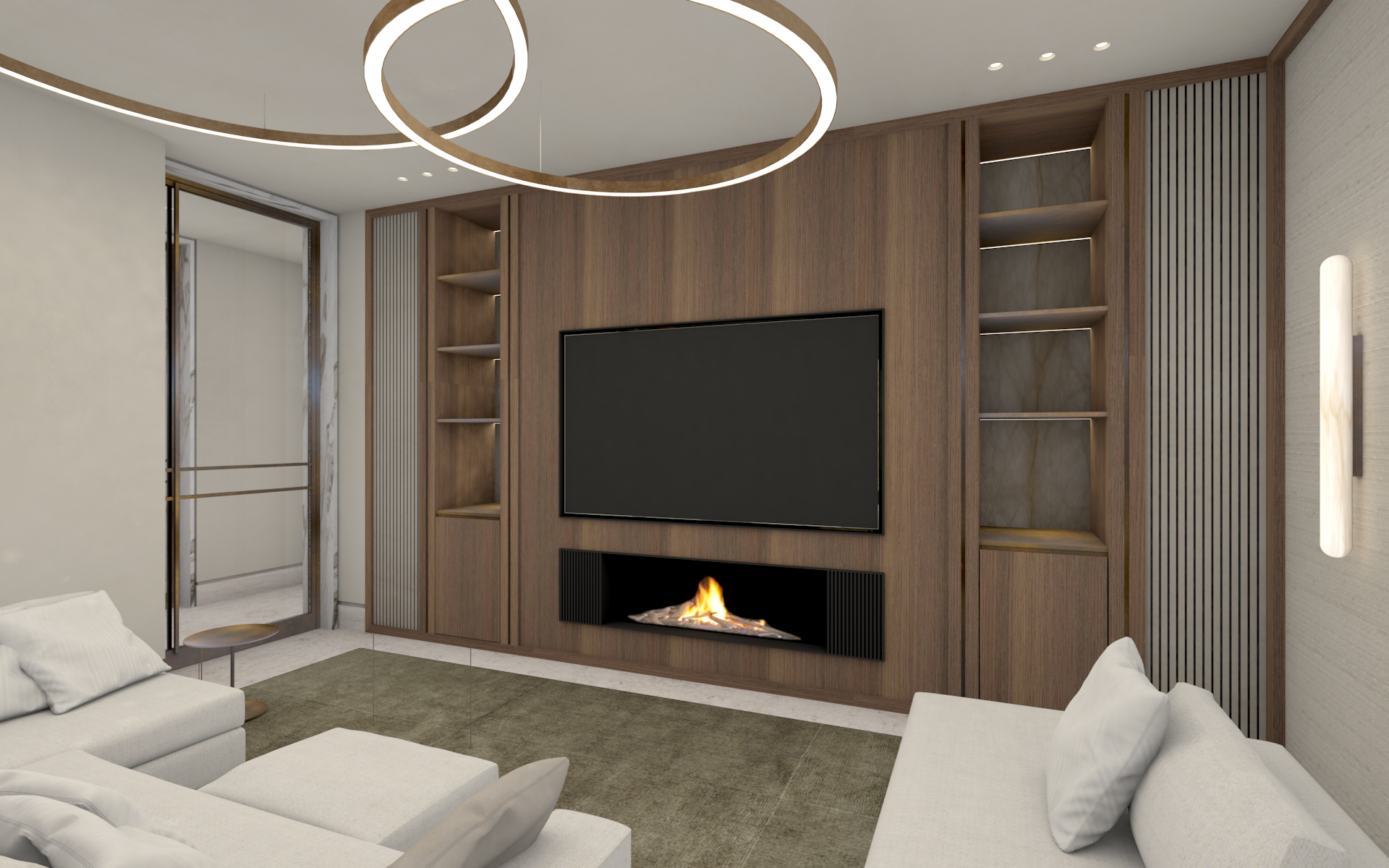 cozy luxurious television room place 5 design objects on the shelves make the fireplace look photorealistic give carpet soft feeling and do not change the green color of it