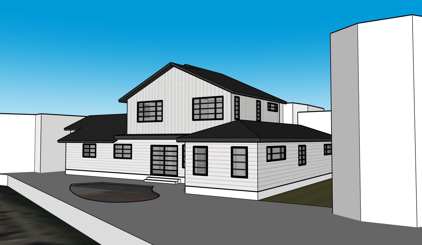 sunny day with a few clouds this view is looking northeast add trees to the sides but don t block the house too much show water in the pool the pool is the small depression in front of the house
