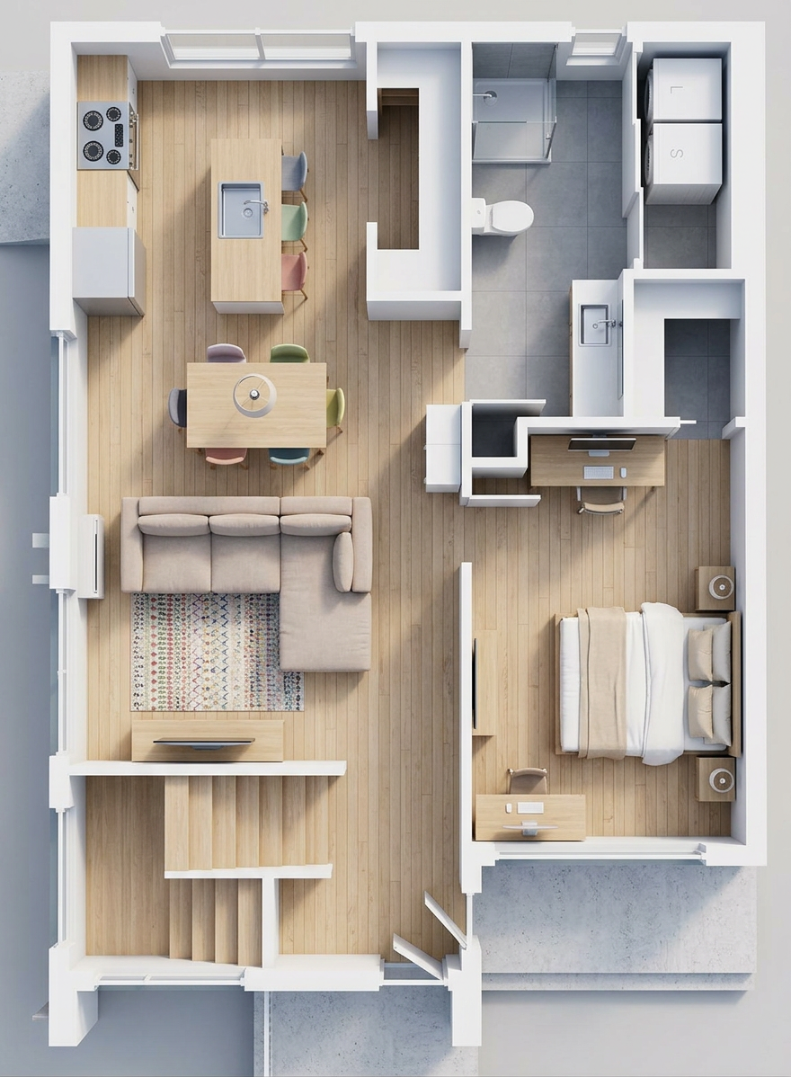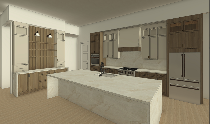 ealistic photographic interior rendering in soft natural daylight preserve the architectural layout exactly as shown in the base image hardware and sconces champagne brushed bronze warm aged refined not yellow brass not chrome