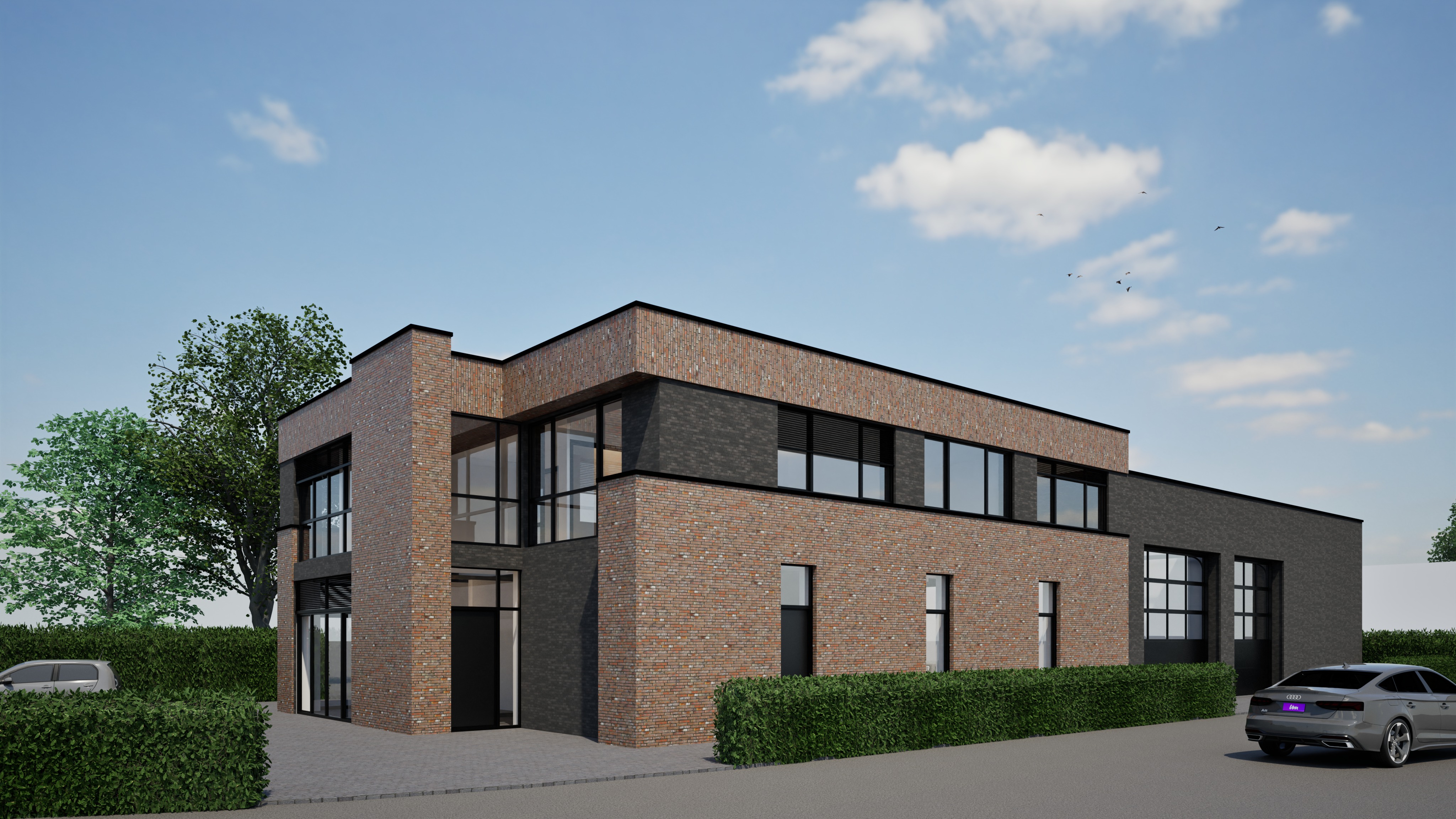 archsynth max control prompt ultra photorealistic architectural photoreferenzbild ist verbindlichuse the uploaded rendering as strict reference geometrie kamera fassadenlayout klinkerformat fugenraster proportionen und komposition m ssen identisch bleiben no redesign no reinterpretation no geometry change lock geometry lock material gridhard lock on building shape facade structure brick grid alignment brick spacing joint thickness window placement camera positionthe brick pattern must remain pixel aligned to the reference goal zieltransform into an ultra photorealistic real architectural photograph shot in summer ergebnis muss wie ein echtes foto wirken kein cgi look camera fotolookprofessional architectural photography35 50 mm full frame lensstraight verticalsneutral perspectivenatural exposurerealistic hdr range no artificial contrast lighting very important sehr wichtigphysically accurate summer daylight sun direction from viewer front side angle ensures both sides of the building remain well lit no facade may fall into full shadow avoid strong side light that darkens one facadeuse soft frontal sunlightbright ambient sky illuminationnatural bounce light from ground and environmentresult both visible building faces bright readable evenly illuminated with only soft realistic shadows no dramatic shadow split across facade brick facade kritisch nicht ver ndernblack brick with black mortar joints keep exact brick layout from reference strict requirements bricks must be perfectly straight rectanglesmortar joints must be perfectly straight continuous linesno bending warping wobbling melting or reinterpretationno ai generated new brick patternanti blur anti smoothing rules facade texture must remain razor sharpno blurno painterly smoothingno texture averagingno procedural brick regenerationno low frequency texture washoutensure ultra high resolution brick detailclear edge separation between brick and mortarvisible micro contrast between materialssharp brick corners no rounded cgi softening the brick grid must look architecturally constructed not ai generated glass fensterrealistic transparent glassinterior subtly visiblenatural reflections onlyno mirror effectno opaque cgi glazing foreground very important vordergrund sehr wichtigthe foreground elements are mandatory and must remain clearly visible sidewalk b rgersteig in front of the building must be present and realistic street stra e must be present next to the sidewalk the curb lowering between the hedges bordsteinabsenkung zwischen den hecken is important and must be clearly visible and physically plausibledo not remove themhide themcrop themreplace themreinterpret their geometrythey must appear as realistic photographed urban foreground elements environment umgebungbackground realistic commercial industrial areakeep additions photorealistic and physically plausible realism constraints verbotedo not change brick geometrychange joint spacingdistort facadestylize imageblur texturesdarken one facade into shadowinvent new materialsremove or alter sidewalk street or curb loweringphotorealism must come only from lighting physicsmaterial responsemicro imperfectionsnot from redesign outputultra photorealistic architectural photographsummer daylightfacade pixel sharpnatural color responseprofessional real camera lookindistinguishable from real photography rot blauer klinker wie wittmundert torfbrand schwarzen klinker erhalten schwarzer klinker im hinteren teil hochaufl send darstellen klare darstellung der fugen und klinker decken im innenraum wei hintergrund b ume und gewerbe durch b ume sichtbar hecker hinterm haus decke im innenraum wei hell
