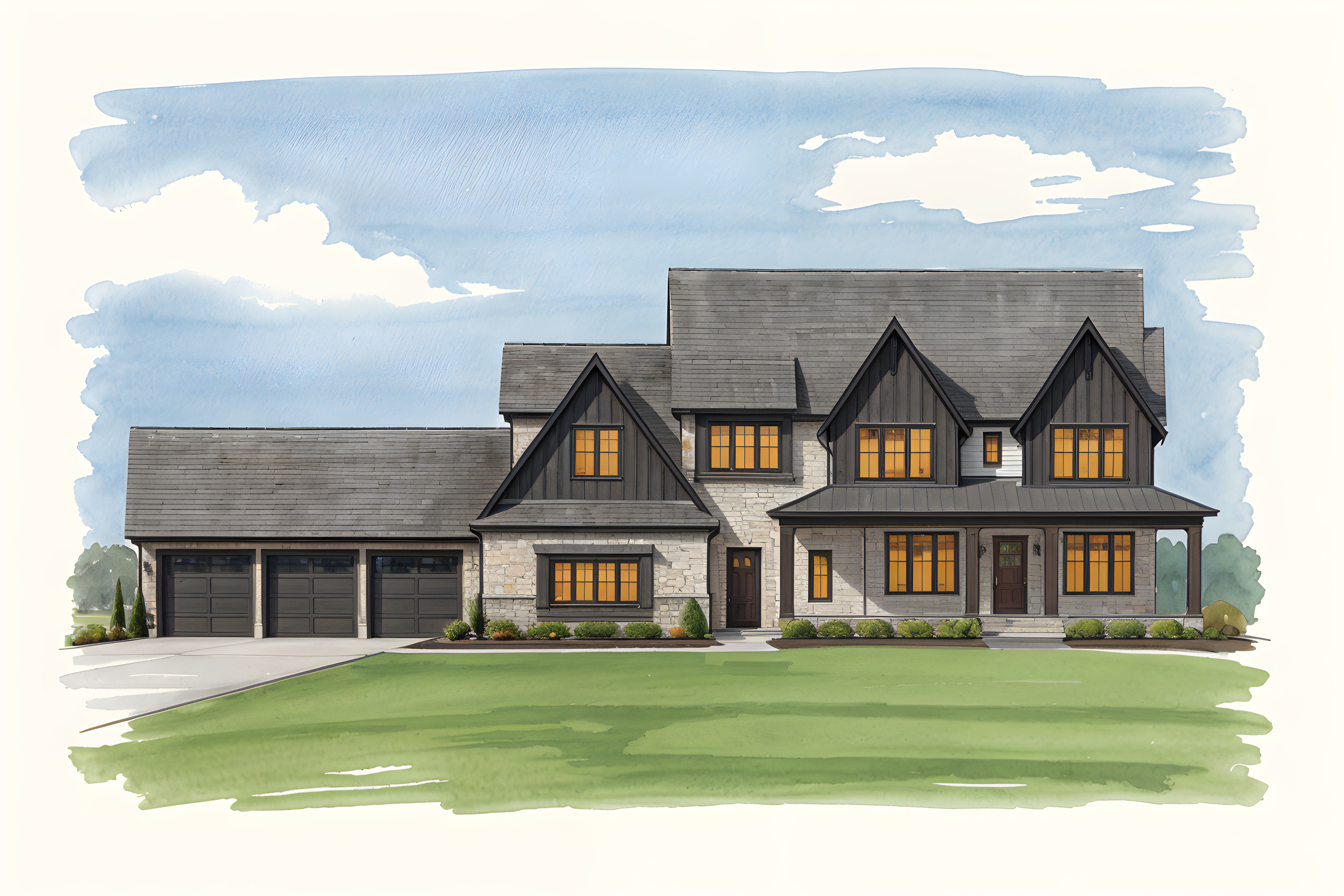 create an ultra photo realistic daytime rendering of this home exterior maintain the same camera angle framing and proportions as the input image the house should have a charcoal standing seam metal roof and dark vertical panel siding contrasted with light stone veneer walls use black window frames with warm interior lighting that gives a soft golden glow through the glass the driveway should be smooth light gray concrete and the front lawn should appear lush freshly cut green grass with realistic texture and subtle shadows add natural soft daylight reflections on the windows and roof accurate lighting direction and soft ambient occlusion around trim and eaves surround the home with subtle realistic landscaping low boxwood shrubs mulch beds and light background trees fading into depth of field use high resolution materials for all surfaces realistic stone grain painted wood texture and metal sheen the lighting should feel like a crisp minnesota late afternoon summer day with soft sky reflections and gentle contrast rendering style photo realistic architectural photography cinematic depth natural lens blur real world proportions 8k detail architecture