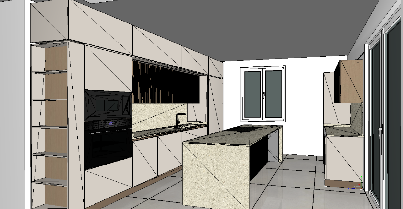 night vision with under cabinet lights illuminating the work surface lights outside the window and linen curtains very very soft ambient light