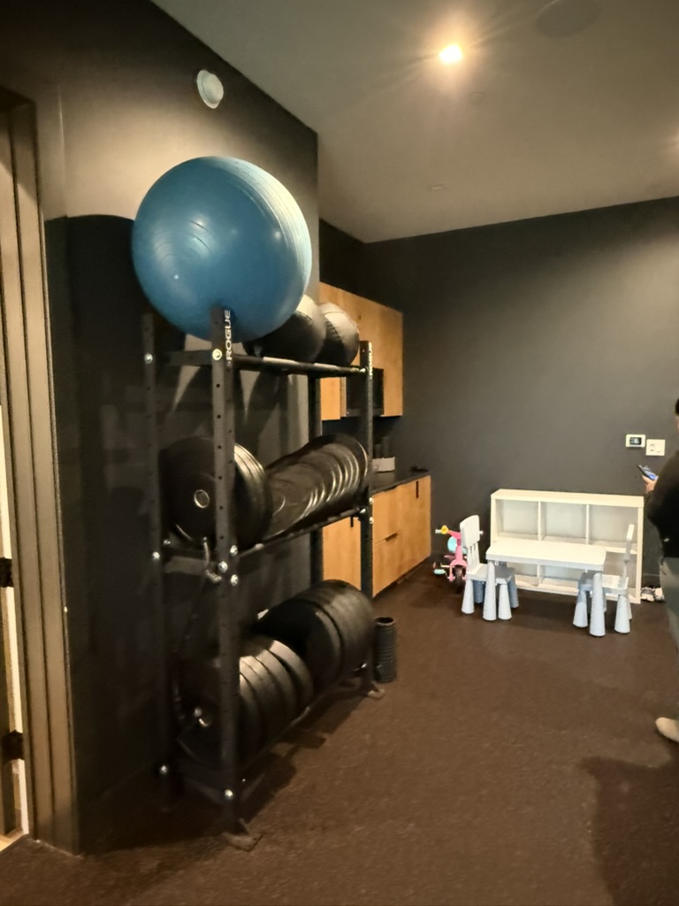 remove the weighted plate and medicine ball storage rack replace with a set of adjustable dumbells with a stand and a free weight dumbell tree whatever space is left above the storage system add artwork that a high end luxury gym may have something with red accents or warm accent colors remove the kids table and toys