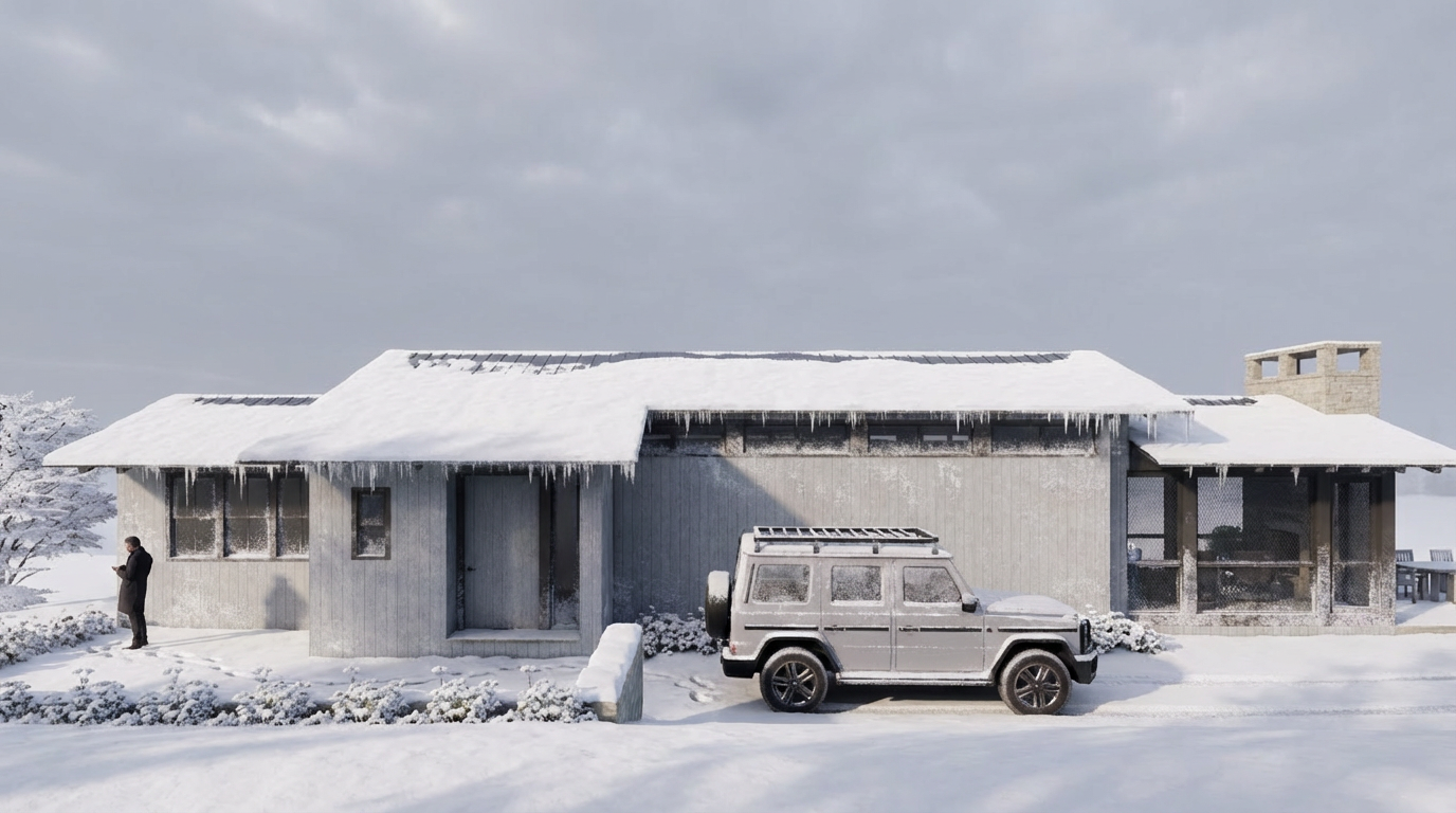 keep size and ratio of image add snow to the scene make materials realistic but no snow in roof