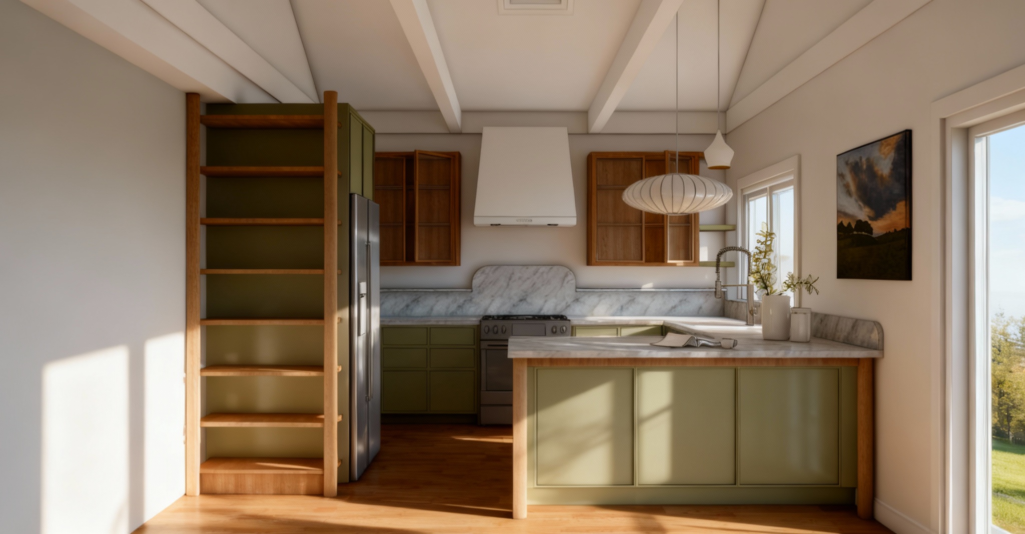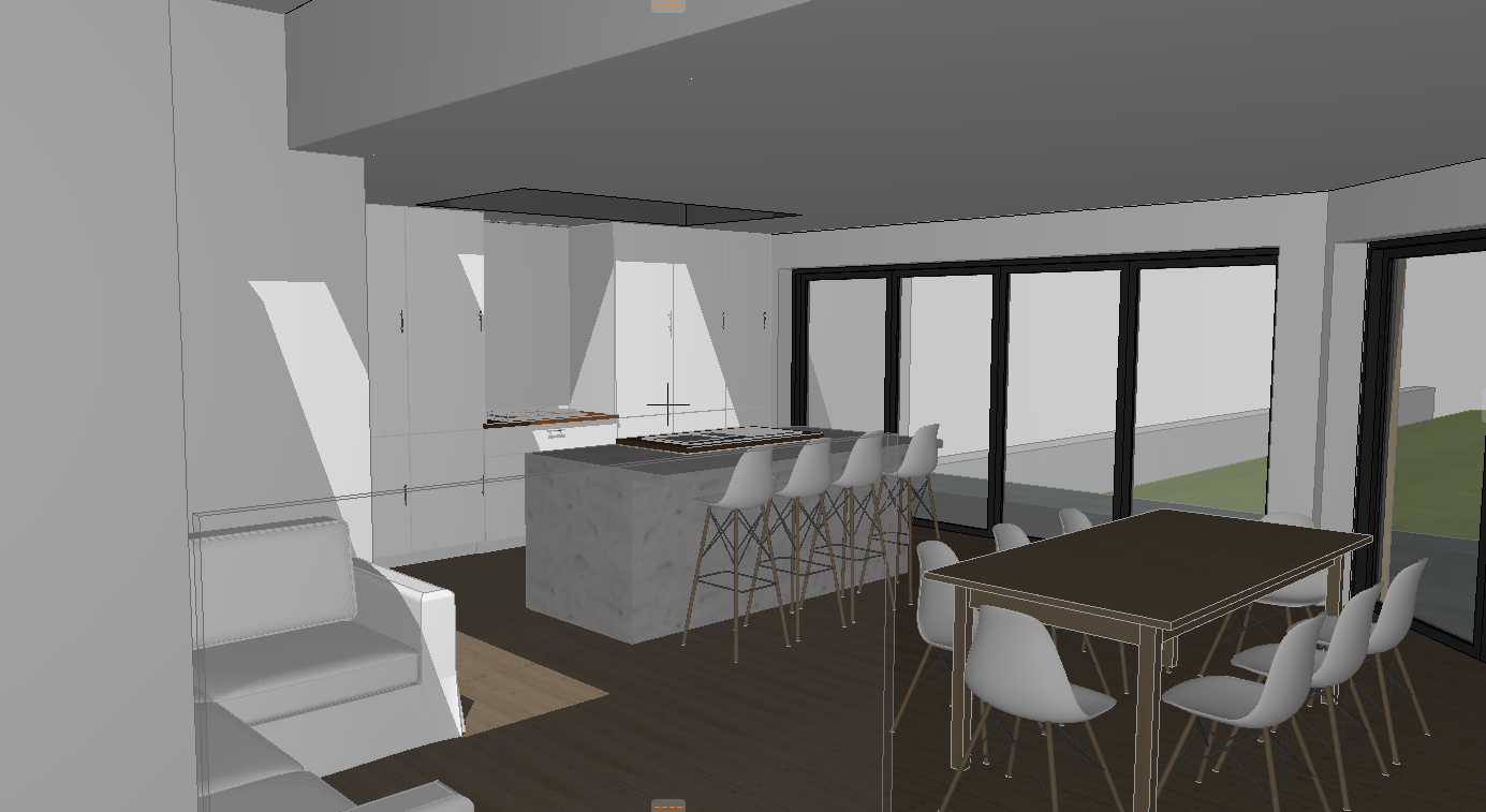 render a modern kitchen and dining area with a minimalist design use a soft neutral color palette with white walls and cabinets the kitchen island is made of white marble with subtle gray veining include sleek white bar stools with light wooden legs the dining table has a dark wood surface complemented by white contemporary chairs the floors are rich dark wood for a warm contrast incorporate large floor to ceiling windows creating an airy atmosphere with natural light streaming in add gentle shadows and a serene elegant ambiance