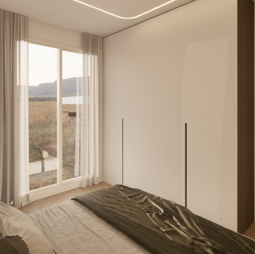 ultra high quality photorealistic render of this exact bedroom from this camera angle keep the same design same layout same wardrobe size and door divisions same recessed handles same window position same curtain placement same bed position in foreground same ceiling led line and same material palette do not change the design or move anything make the scene look like a real luxury interior photograph with soft warm daylight and premium material realism material direction wardrobe should remain warm off white ivory matte finish very clean seamless and elegant keep the recessed vertical handles exactly as they are but make them sharper and more realistic the side wood panel should remain warm natural oak veneer with a refined grain and premium matte satin finish bed textiles should stay soft ivory beige the dark throw blanket should remain but make it look richer and more natural with realistic woven texture soft folds and elegant drape curtain fabric should stay light and sheer with realistic translucency and soft vertical folds floor should remain light oak herringbone parquet with proper texture scale subtle tone variation and soft natural reflection lighting preserve the existing soft indirect ceiling led use natural daylight from the large window door opening on the left keep the lighting warm calm and balanced create soft contact shadows realistic bounce light and subtle depth no overexposure no flat cg lighting rendering quality ultra realistic materials premium matte surfaces realistic textile depth believable curtain translucency seamless wardrobe finish crisp joinery and refined edges subtle realistic reflections only where needed high end residential interior photography mood minimal and elegant atmosphere important do not change wardrobe design do not change window or curtain design do not move the bed do not add furniture or decor do not redesign anything only improve realism material richness and lighting quality negative prompt do not change design do not change layout do not move furniture do not change wardrobe divisions no extra furniture no extra decor no glossy wardrobe no plastic looking fabric no harsh shadows no overexposed highlights no fake reflections no clutter no low realism