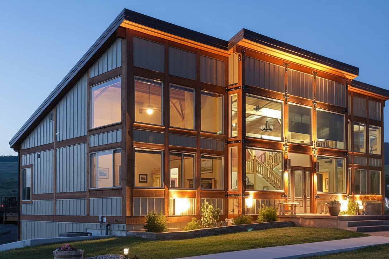 white siding gray stone gray shingle roof dark gray metal roof add landscaping add sky