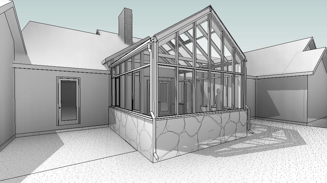 render a sunlit conservatory extension with a rustic stone base and large glass panels surrounded by a house with a modern design the conservatory extends into a brick paver patio with potted plants and patio furniture use soft beige and light gray for the walls and warm earthy tones for the stone base the glass should reflect a clear blue sky add gentle shadows for depth the atmosphere is tranquil and inviting with a cozy warm light illuminating the glass interior suggesting a peaceful afternoon