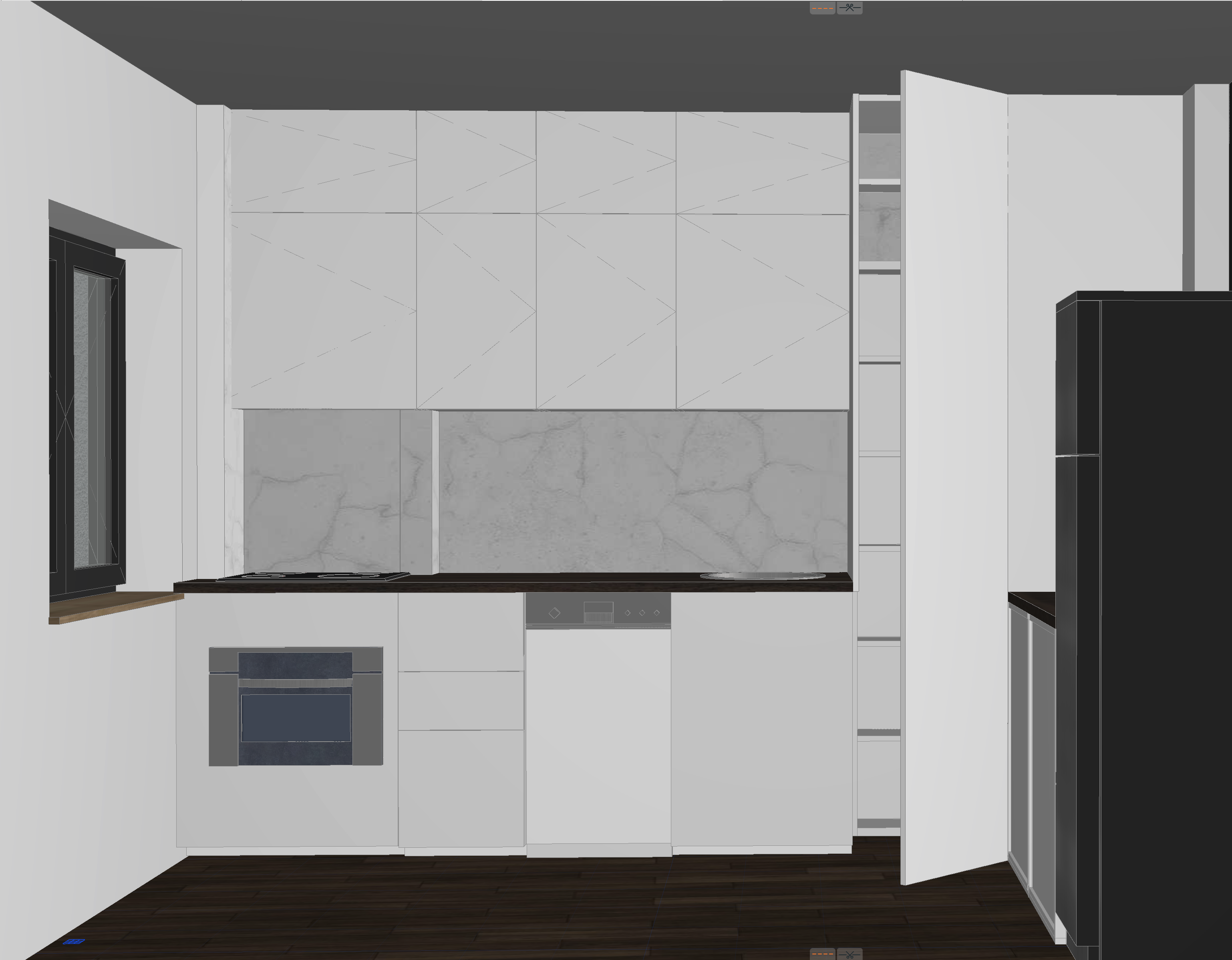 modern narrow kitchen interior realistic proportions frontal perspective kitchen furniture with mdf doors in light wood finish light oak or maple tone matte flat panel handleless design for a clean minimalist look countertop made of polished black marble with fine white veining creating strong contrast with the light cabinetry linear kitchen with built in oven and cooktop integrated sink continuous countertop and upper cabinets aligned vertically and horizontally right lower cabinets with matching light wood mdf fronts tall unit with stainless steel refrigerator floor finished with beige ceramic tiles subtle texture medium size warm tone to balance the dark countertop and onyx wall walls in smooth light neutral finish off white or very light grey lighting warm ambient lighting combined with led backlighting behind the onyx slab and under cabinet lighting to emphasize materials and depth style modern minimalist warm contemporary balanced contrast between light wood dark stone and soft neutral surfaces